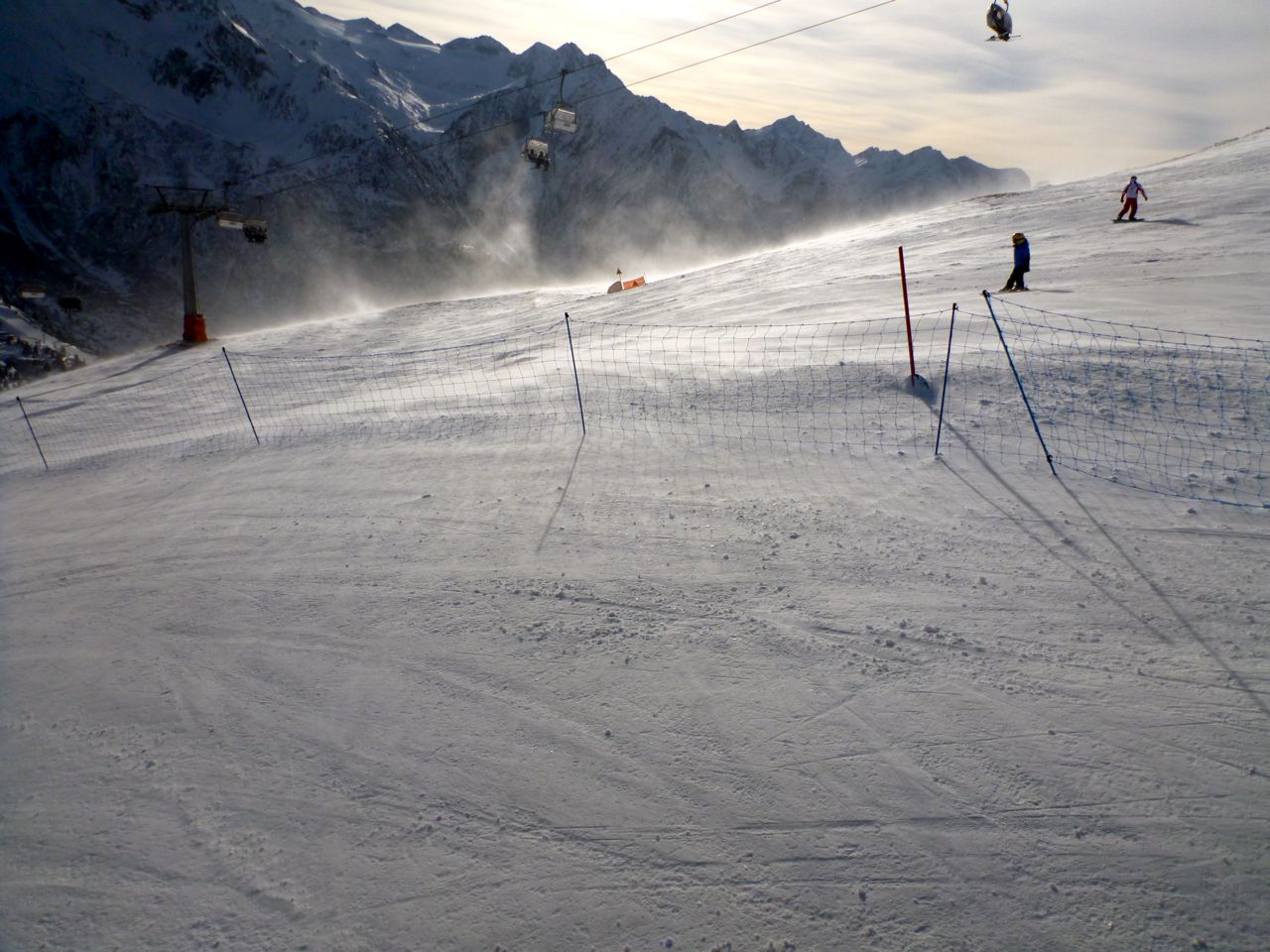 Faceva meno caldo ma... il vento si e' scattenato ancora di piu' rispetto alla mattinata, fermando le seggiovie rimeste in funzione piu’ o meno ogni 5 minuti. Ho tentato qualche salita e i e' rimasto in memoria un simpatico episodio dove ero fermo sulla seggiovia in mezzo a delle raffiche scatenate insieme una sciatrice visibilmente impaurita che malediceva il momento nel quale aveva deciso di salire. Io volevo cogliere l'occasione per scattare qualche foto, ma non mi sembrava il caso. Avevo troppo rispetto per il terrore della mia compagna di seggiovia. Dopo un po' di salite di questo tipo, avevo rinunciato di sciare, ma mi fermavo in mezzo alla pista per scattare delle foto della neve mossa dal vento... e una volta fatte queste, sono tornato al pulllman, forse mezz'ora prima di quello che avevo pianficato all'inizio della giornata.