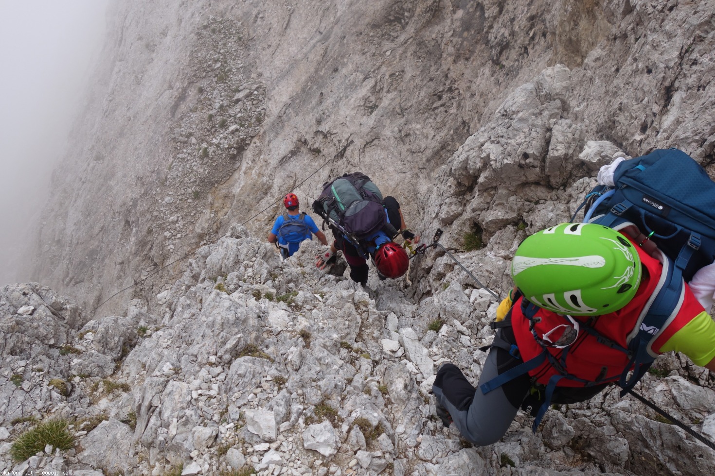 finita la discesa si arriva all'attacco del sentiero attrezzato Nico Gusella, che è un lunghissimo traverso sali e scendi sullo zoccolo della cima di Ball