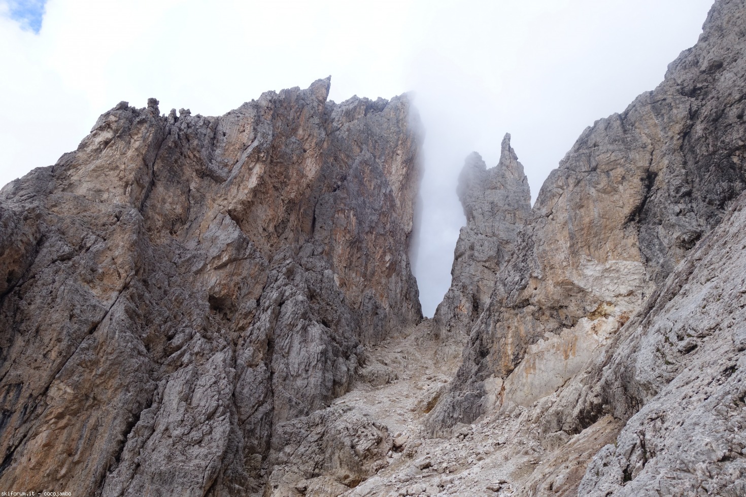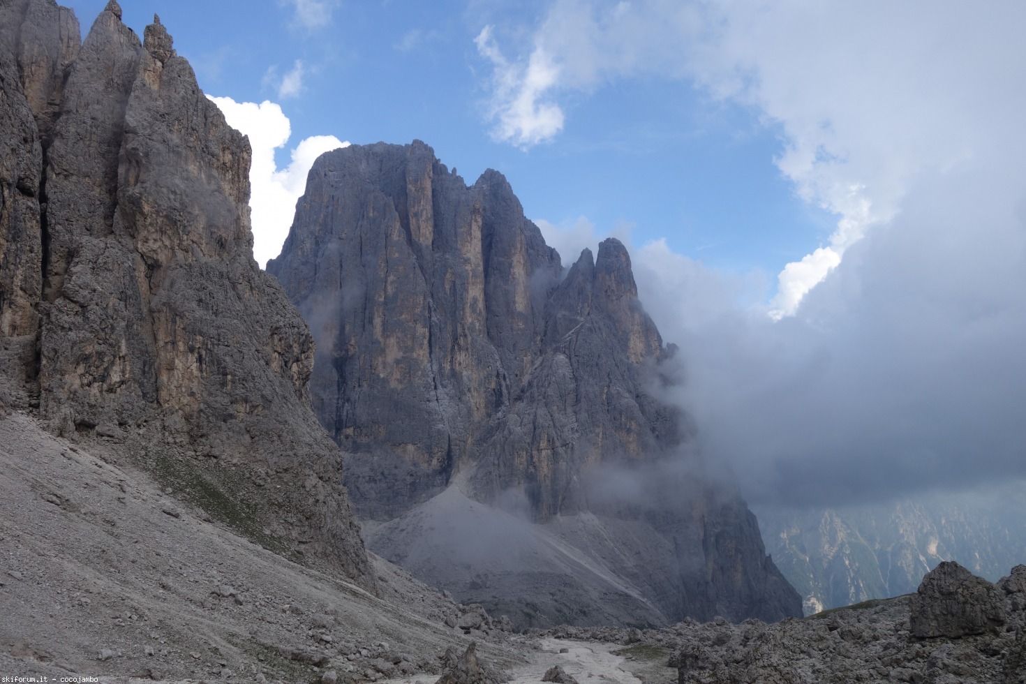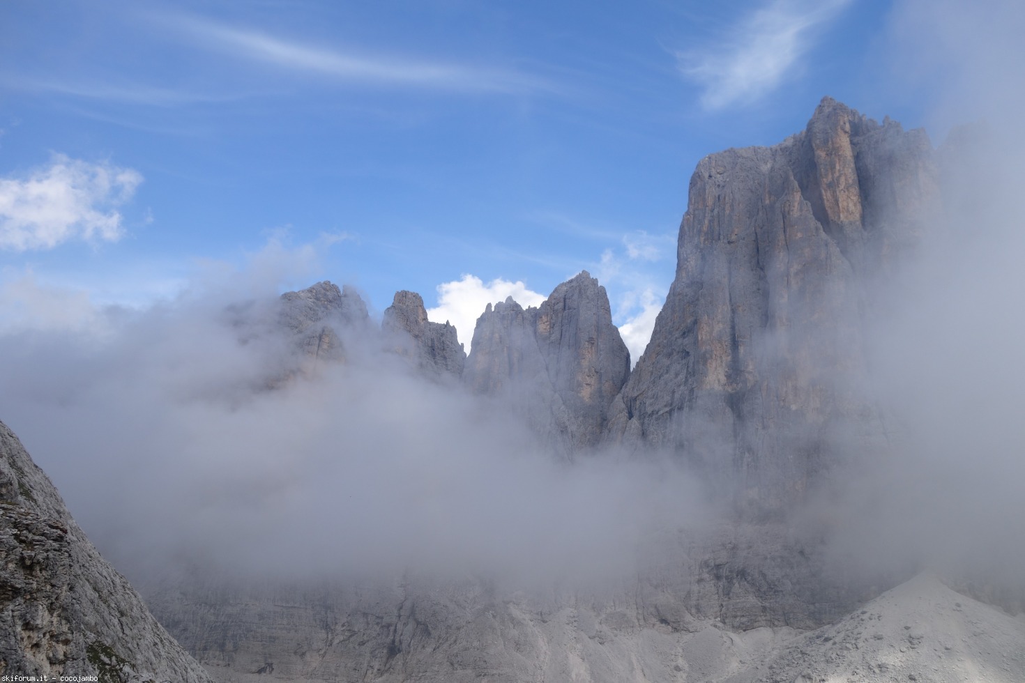 senza quasi accorgercene siamo arrivati a forcella Stephen (il cartella dal Porton mette 2 ore, si sta meno! )se non sbaglio davanto c'è cima Pradidali e dietro cima Wilma e più in là ancora tra le nuvole la Fradusta a sovrastare