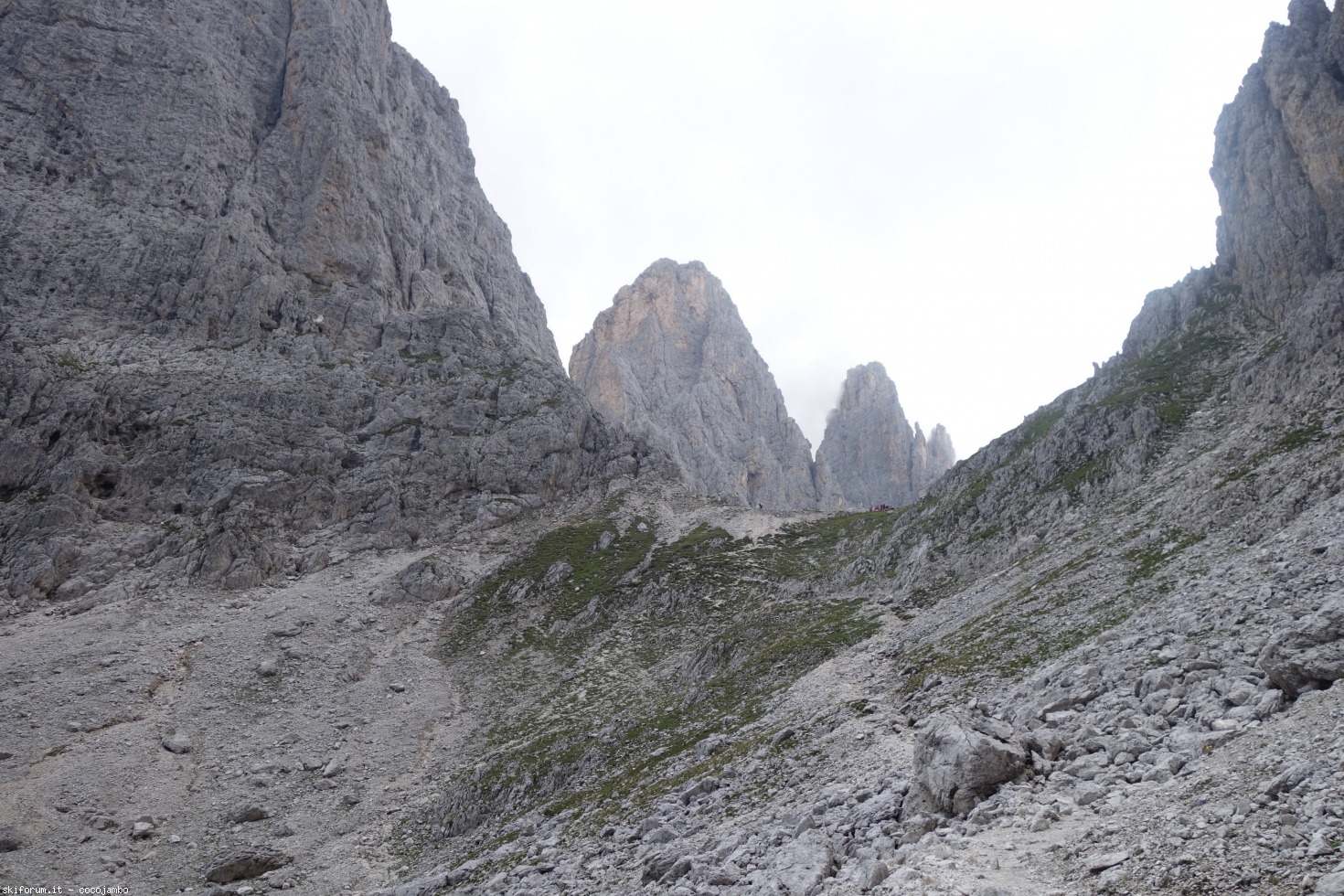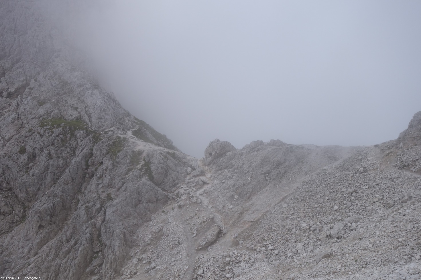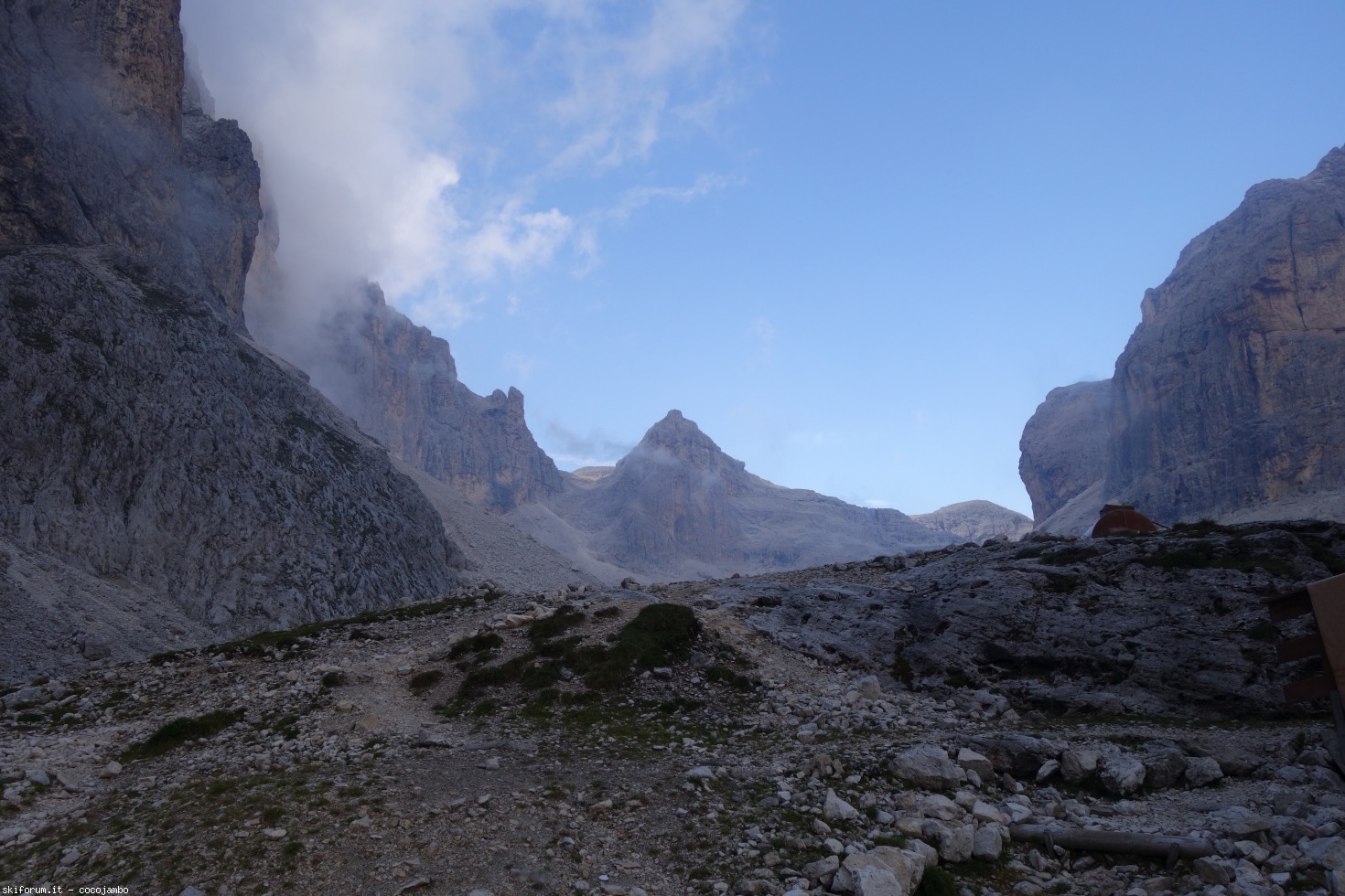 senza quasi accorgercene siamo arrivati a forcella Stephen (il cartella dal Porton mette 2 ore, si sta meno! )se non sbaglio davanto c'è cima Pradidali e dietro cima Wilma e più in là ancora tra le nuvole la Fradusta a sovrastare