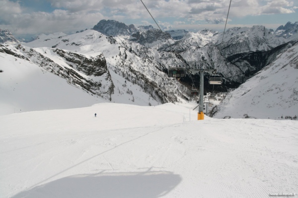 [i]Primi pendi soleggiati della pista Padon A di Passo Padon - Malga Ciapela, Dolomiti Superski.[/i]