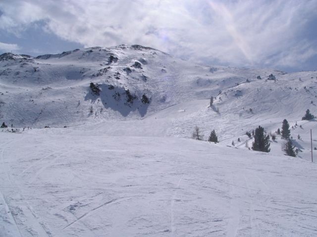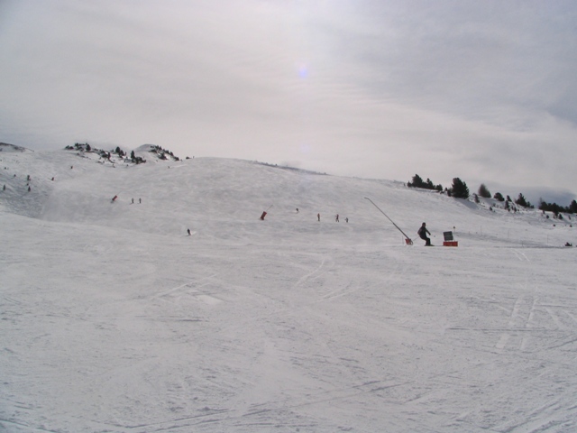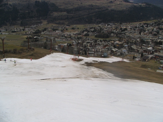 provo subito una discesina verso il ciuk, e mi rendo conto che la situazione è critiche..una lastra di ghiaccio totale..riesco ad arrivare alla seggiovia senza ribaltarmi e inizio a risalire verso le alte quote, dove la neve non dovrebbe essersi trasformata più di tanto..con 3 tronconi di seggiovia raggiungo la Cima Bianca, 3012m panorama spettacolare in ogni direzione..qui la neve è decisamente meglio, mi faccio 3-4 discese lungo l'ultimo tratto di seggiovia e me le godo per anche anche perchè c'è pochissima gente..poi sciaguratamente riprovo a riabbassarmi di quota verso Bormio2000 ma mi imbatto nella pista Stella Alpina che è divisa in due: da un lato ghiaccio, dall'altra sassolini ghiacciati..dopo un po' di smadonnare decido di risalire in cima con la funvia di Bormio 3000 (permettetemi, una bella merda come impianto..)..provo la pista "Bimbi al sole": sempre e solo ghiaccio..risalgo su, è quasi mezzogiorno, mangio qualcosa in cima e decido di buttarmi sul versante est..finalmente scopro una zona stupenda intorno alla "Stelvio"..nonstante abbia varie deviazioni, mi piace immaginare la stelvio come una lunga autostrada che dalla Cima Bianca scende in paese: una pista stupenda, largissima, neve ottima, poca gente..una meraviglia..rimango li per quasi due ore..giunta l'ora di scendere, dopo essere stato tentato a prendere la cabinovia, decido di scnedere in apese con gli sci, nonstante già a 2200 metri la neve fosse pappa..una bellissima surfata di sci d'acqua, non avevo mai visto una neve tanto marcia nemmeno a casa mia!! mamma mia, però sempre meglio la neve marcia che il ghiaccio della mattina!alla fine arrivo in fondo, sudato fradicio, lungo una misera strisciolina di neve in mezzo ai prati pieni di letame....