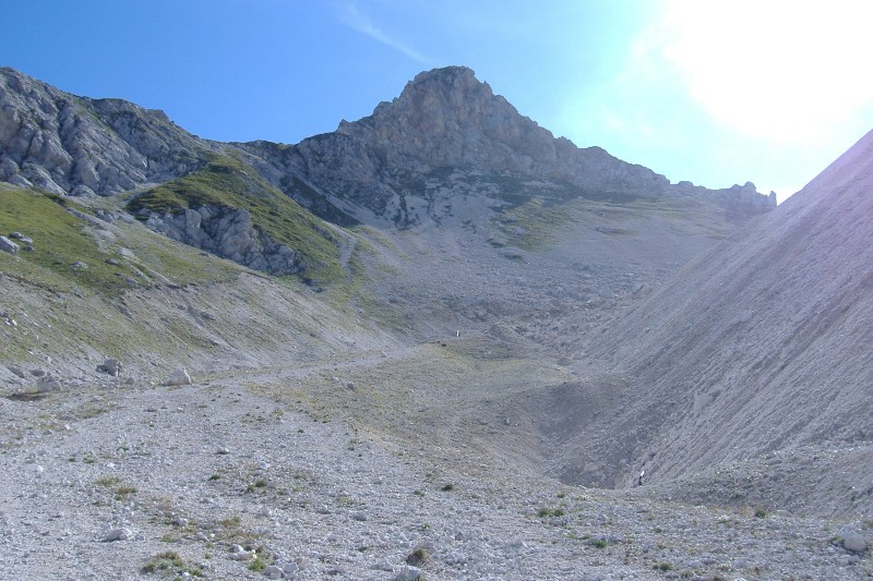 Si cammina sul fondo della piccola valle sovrastata dall'imponente Monte Forato.