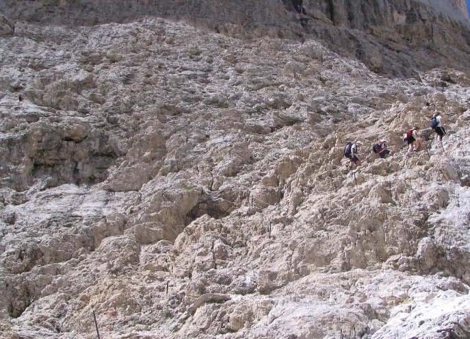 Dopo questo tratto il cammino spiana leggermente attraversando in orizzontale la gola del Gartl con qualche semplice roccetta per poi riprendere con un altro cordino che aiuta a rimontare sul versante opposto ; si tratta di un passaggio piuttosto ripido in cui è necessario fare parecchia forza sulle gambe.