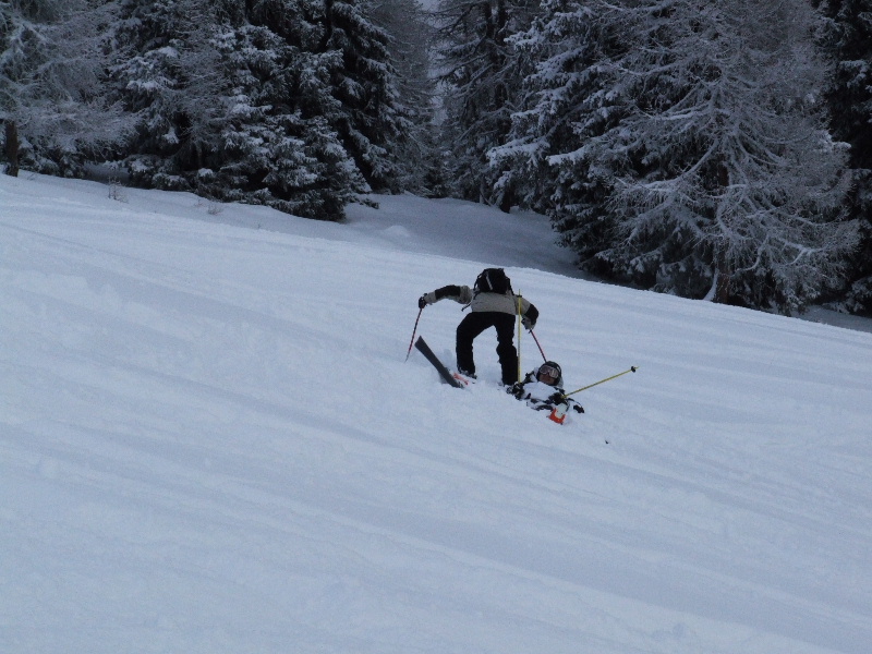 Grande tecnica di Wally con Fummino che segue a ruota. Magister Pepo vola mentre il sottoscritto affina la nuova tecnica di freeride senza bastoncini: arrivato alla sera avevo due cosce che sembravo Bergomi!
