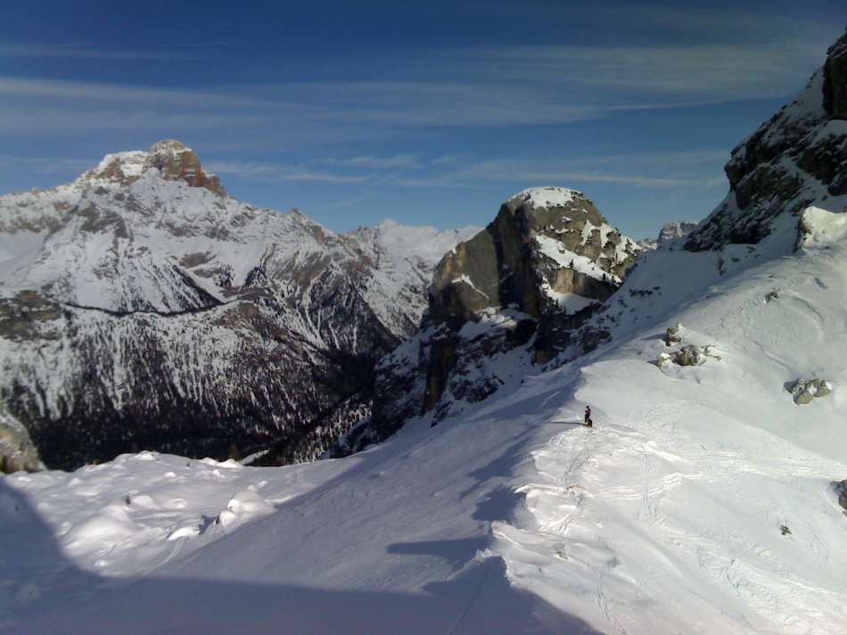Erano parecchi anni che ogni volta che arrivavamo a Cortina d’inverno, tra le varie fantastiche cime che attirano subito l’attenzione, lo sguardo cadeva poi inesorabilmente su quel canalone che è lì, talmente evidente, da non poter proprio essere ignorato! Peccato che, grazie agli aridi inverni di questi ultimi anni, e alla sua sfavorevole esposizione, non fossimo mai riusciti a beccarlo al momento giusto: o la neve non era ancora stabile o era troppo poca o più spesso non c’era proprio o al momento giusto non potevamo noi…..insomma sempre una, fino a quest’anno, quando grazie alle abbondanti nevicate del mese scorso, ora che la neve si è assestata per benino, ecco comparire il momento propizio! Da non poter mancare!! Così venerdì, insieme al mio socio, riusciamo finalmente a toglierci sta soddisfazione. Le condizioni erano(e sono) perfette: neve abbondante fin dalla base, tutta la miriade di mughi che c’è alla base delle rocce sono coperti, e il canalone è ben innevato e stabilizzato, oltre a una stupenda giornata a contorno!