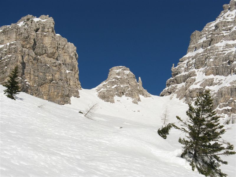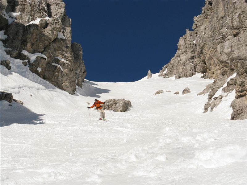 Prosegue quindi con successo l’anno dei “percorsi meno percorsi” ma che meriterebbero maggior considerazione! E così qst domenica è toccato ad un altro evidente canale che era in standby già da qualche anno. Anche questo abbastanza evidente, ma stranamente mai menzionato in nessuna guida, nonostante invece la splendida discesa che ha saputo offrire a differenza di altri più blasonati e meno meritevoli percorsi..…spesso in neve fresca anche vista l’esposizione in pieno nord!!