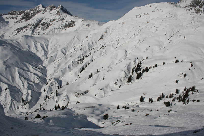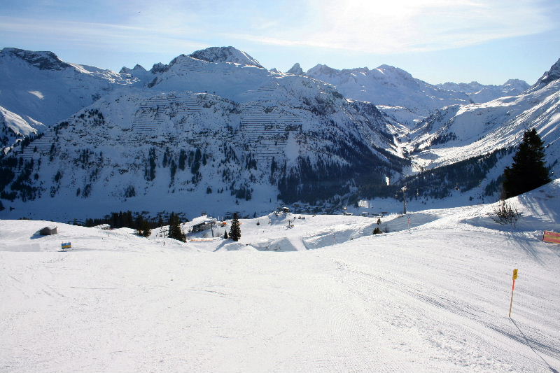 Partendo da Lech si può effettuare un giro orario del carosello ( questa zona conterà sui 150 km di piste oltre ai 100 di St.Anton) e raggiungere prima Zurs e poi Zug. Zug è uno dei più bei posti che abbia mai visto in vita mia: una gemma di 3 o 4 case e alberghi racchiusa in una piccola conca. Purtroppo non ho le foto del paese. La ragione è puramente morale: come ho detto il carosello si gira sci-a piedi in senso orario. Non lo si può fare in senso antiorario perchè da Zug si risale solo in direzione Lech. E soprattutto perchè l'unico modo per scendere da Lech a Zug è di fare un percorso fuori pista. Chiaramente l'idiota del sottoscritto non aveva capito che il giro antiorario non si poteva fare ed ho costretto quella povera creatura della mia ragazza a farsi la skiroute. Peraltro non impegnativissima ma per la mia povera anima gemella è stata un'autentica tortura per di più sotto il caldo infernale di una zona completamente esposta al sole!