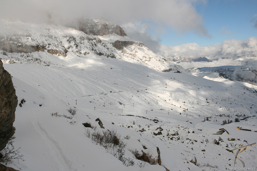 Sci in auto e tanta neve... al Passo Pordoi l'idea "di ripiego"! Partire dal passo e arrivare con le pelli fino al Rifugio Sass Becè e da li discesa fino al ponte di cemento dove parte la seggiovia Fodoma.