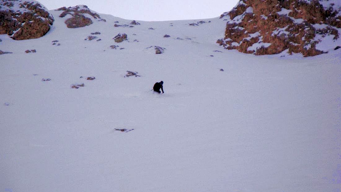 a questo punto altri 200 metri divertenti, per la maggior parte in buona polvere (di cui non ho foto) e poi un lungo traverso/fondovalle dove procediamo a forza di braccia :-?