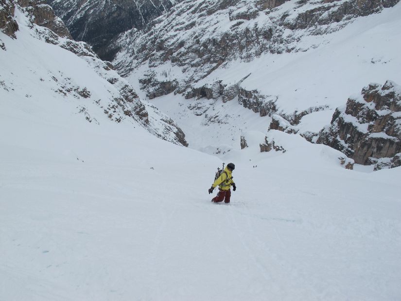 Guardandoci indietro si vedono i 3 canali più l’Adriana. Si noti come il Canale 1 sia il più lungo, ripido e stretto dei 3 con alcune rocce all’uscita che potrebbero infastidire in caso di scarso innevamento; scendendo da questo canale inoltre non si potrebbe godere se non in minima parte del fantastico pendio di cui sopra.