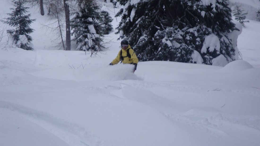 La parte alta, fuori dal bosco è ventata, preferiamo rimanere "bassi" e assaporare più polvere possibile. Sfruttiamo molto le strisce disboscate per il passaggio degli impianti, quelli nuovi ma soprattutto quelli dismessi. Abbiamo però scoperto anche dei boschi molto interessati