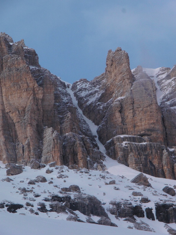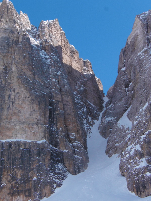 Solo un piccolo appunto: sulla guida di Tremolada questi canali che si tuffano in val mesdì vengono gradati 4.3/5.1, ritengo che vista la pendenza(lunghi tratti sopra i 50°), la larghezza(decisamente meno del sass da forcia) e la lunghezza(poco meno dell'Holzer) si meritino qualcosa di più.