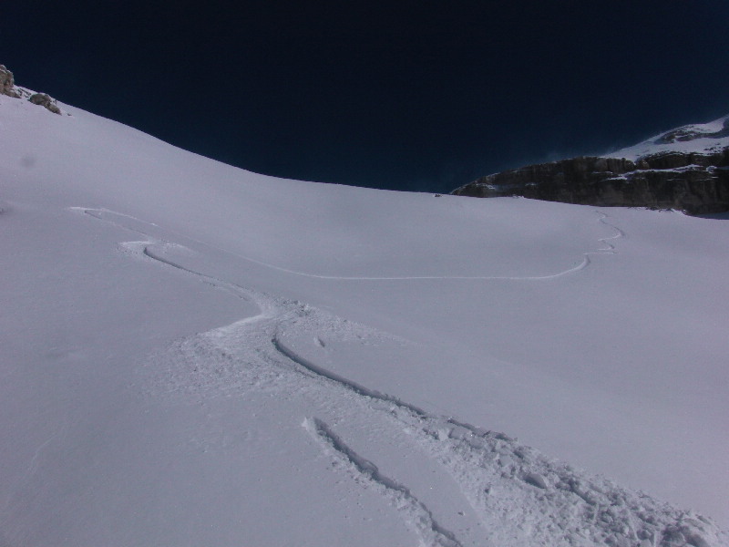 L'indomani ancora un pò di neve nuova, sono di nuovo solo, punto al Boè ma il troppo vento mi fa ripegare verso il Col Alton, che mi regala una felice sorpresa in prima traccia..