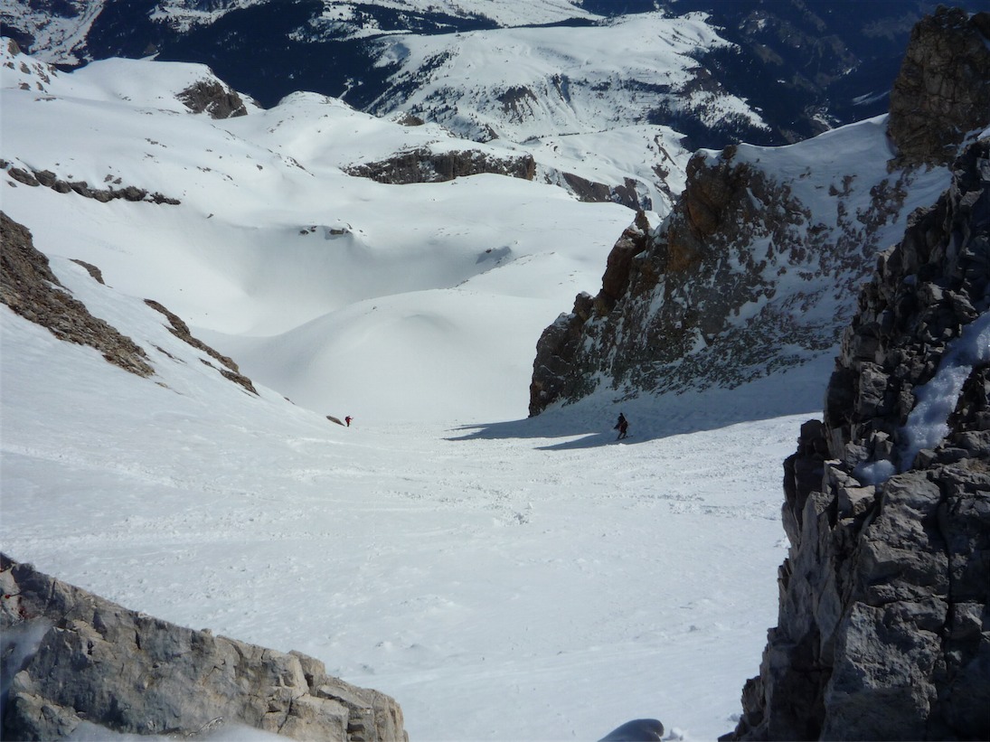 Giunti finalmente all'imbocco del canale ci si presenta un paradiso...un vallone ampio che si restringe sempre più fino a diventare canale non troppo stretto e sempre divertente con una pendenza di circa 40°