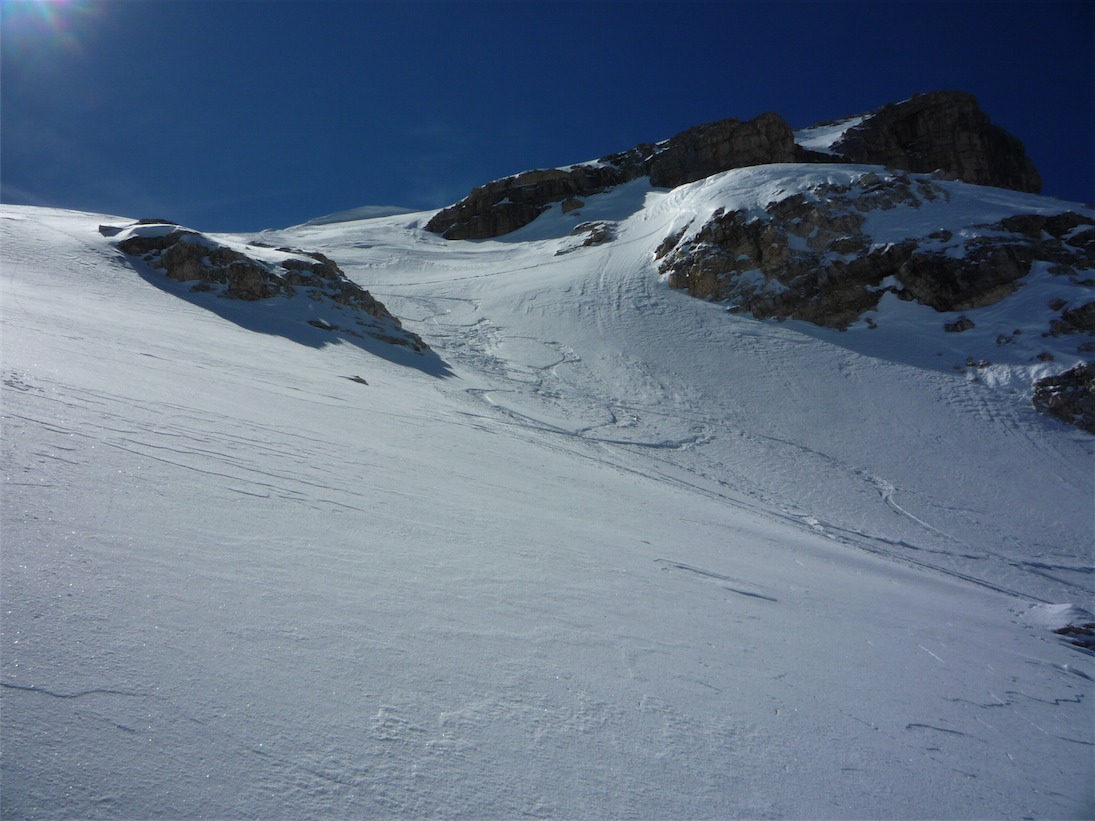 Si scende nel vallone tenendo la sinistra quando si avvistano le rocce. Da qui inizia un traverso che ci porta all'insellatura della Cresta Strenta che si risale sci in spalla per raggiungere il punto di partenza del canale del ghiacciaio.