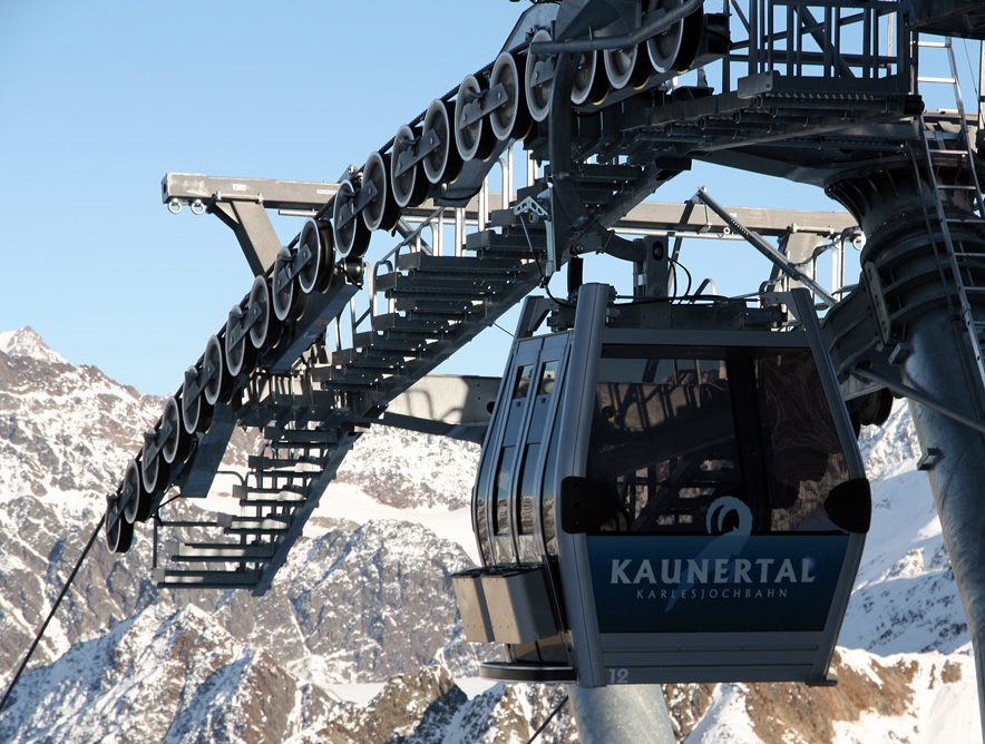 Linea della cabinovia Karlesjochbahn, impianto principale della stazione sciistica di Kaunertal in Tirolo.