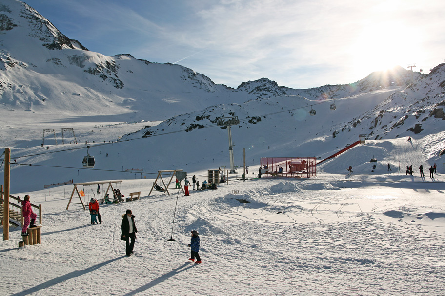 Parco giochi sulla neve per i bambini e le famiglie a Kaunertal, Tirolo, Austria.