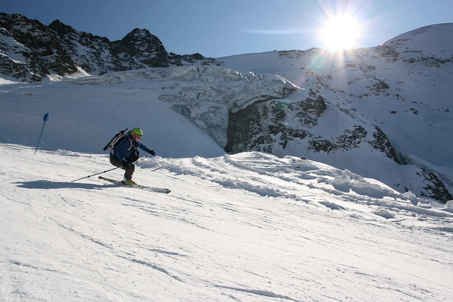 Sicuramente è il ghiacciaio meno esteso dei tre, però nonostante la quota è quello probabilmente più freddo e con un ambiente più maestoso, forse dovuto al fatto che si scia a fianco di grossi seracchi. Offre un dislivello minore degli altri due ghiacciai, dai 3108 ai 2750 solitamente oppure ai 2150 quando è aperta la pista fino ai parcheggi. Le piste probabilmente sono meno pendenti anche se a pensarci bene non si ha l'impressione di sciare sui classici "piattoni" da ghiacciaio.