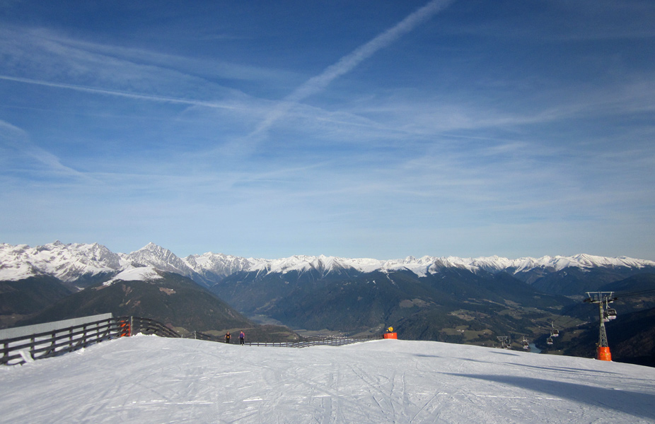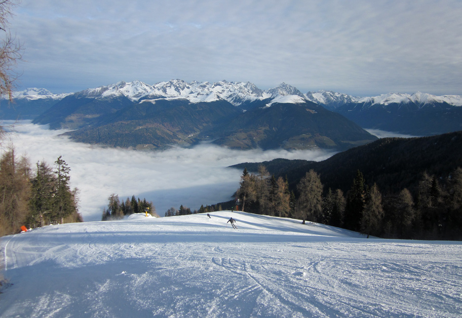 Arriviamo alla intermedia della cabinovia e in pochi secondi la situaizone cambia radicalmente: uno spettacolare tappeto di nubi copre tutta l'alta Val Pusteria e la Val Aurina, sopra di noi un sole quasi estivo. Le prime piste sono verso Riscone.