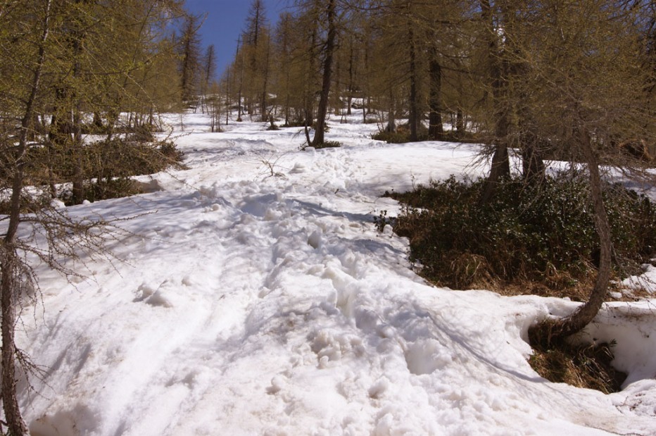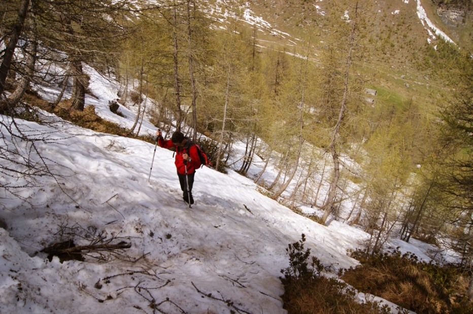 Dopo 40 minuti arriviamo, qui abbiamo una scelta, arrivare fino a pianazoi, quindi fino in fondo alla valle e poi risalire le pendici del Teggiolo, oppure tagliare dritti verso la cima, noi volponi naturalmente ci complichiamo la vita a saliamo tagliando dal bosco, la neve è tanta, la pendenza troppa, le ciaspole non si possono mettere, perché ogni tanto bisogna passare in mezzo ai rododendri scoperti dalla neve...