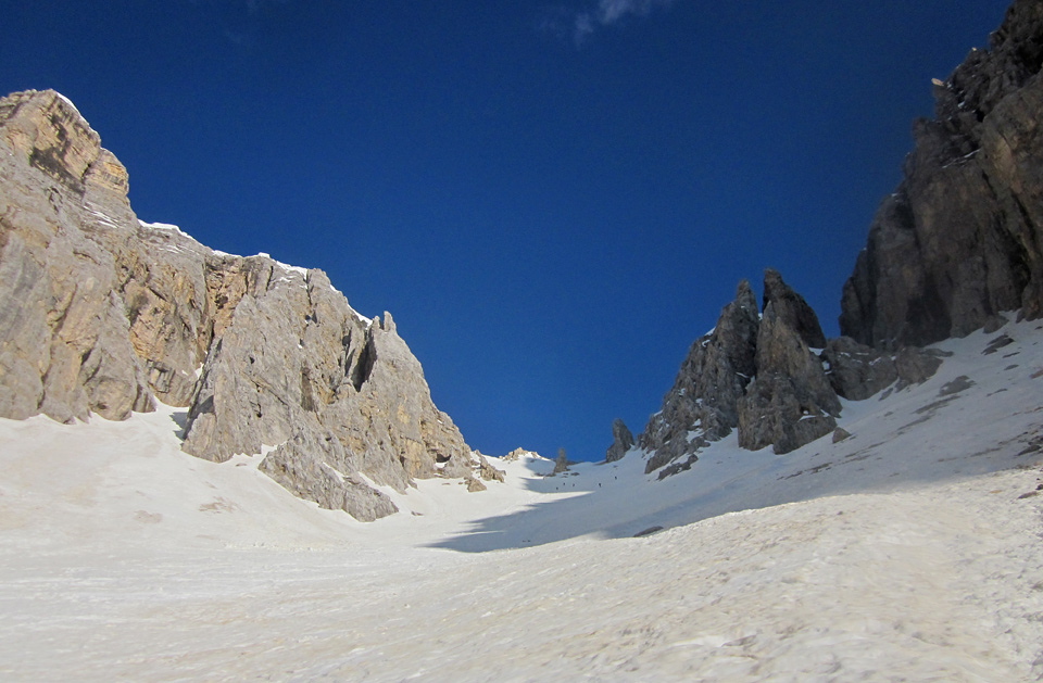 In basso si sale tra gli accumuli delle famose "poderose valanghe" invernali che si scaricano nel canalone. La salita inizia con una pendenza dolce che aumenta gradualmente.