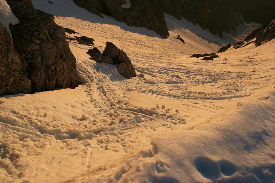 Verso la fine del canalone la salita è bella ripida e si scivola moltissimo. In caso di neve dura e ghiacciata è meglio non scivolare e penso si salga solamente con rampant o ramponi. Ieri la neve era cotta dal sole e morbida e ce la si faceva con gli sci ai piedi. Io ho dovuto caricarmeli in spalla per gli ultimi 10 metri a causa delle solite pelli di m**da che quando non fanno zoccolo, scivolano, quando non scivolano non si attaccano allo sci, etc. mi hanno fatto faticare come una bestia: un passo in avanti e 2 metri indietro.