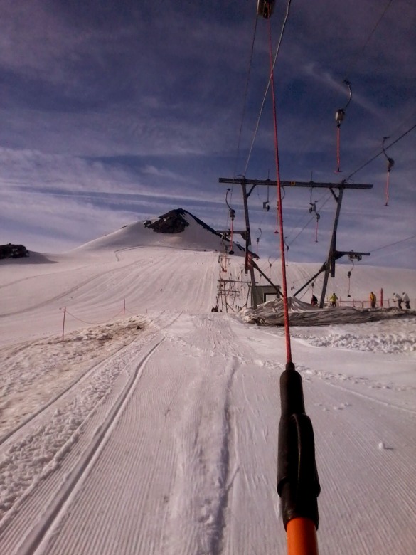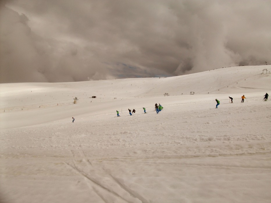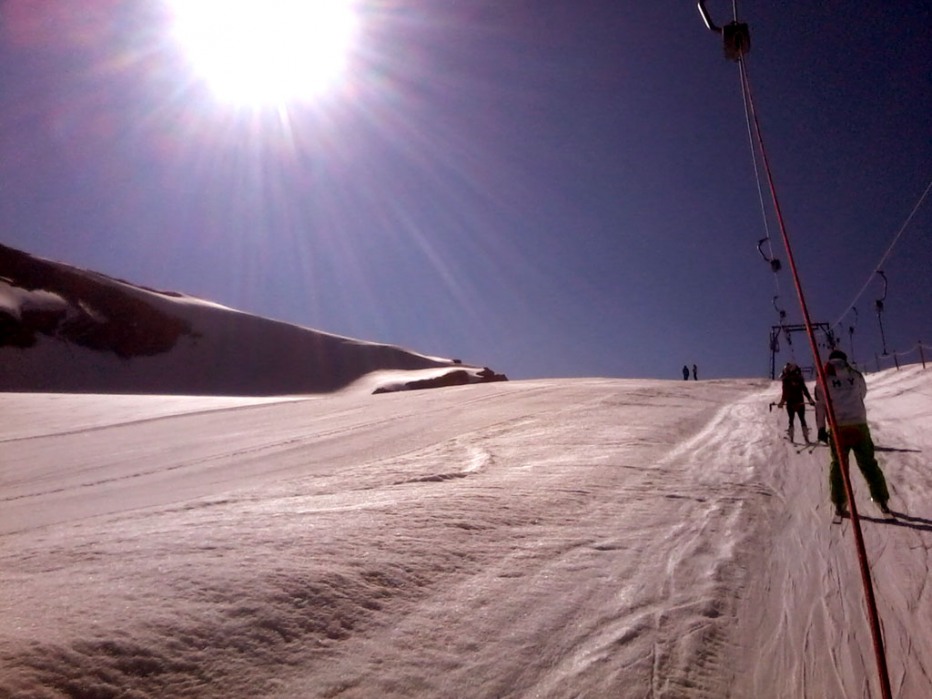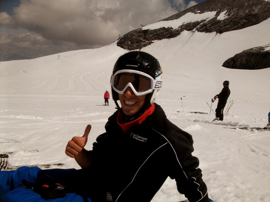 ), risiedevamo all' Hotel Perego. Ogni mattina le funivie aprivano alle 7 e mezza, noi non facendo pali salivamo per le 8 meno un quarto, e dopo mezz'ora ci ritrovavamo sul ghiacciaio... I primi 3 giorni, causa neve molle (sembrava di sciare sulle uova) abbiamo fatto un sacco di esercizi, dal salto da "esterno" ad "esterno", alla sciata su un solo sci, all'incrocio "interno su esterno". In questi primi 3 giorni il tempo era buono il mattino, con sole e nuvole che verso le 11 si incominciavano a compattare per poi scatenare temporali nel pomeriggio sera, in questo modo la neve non riusciva a gelare ed i mattini successivi era marcia e bagnata... Sono stati, i primi 3 giorni, molto utili, in quanto su una neve così difficile, svolgere esercizi aiuta a trovare la centralità. (Tralasciamo il volo che ho piantato, partito l'esterno ho fatto tipo 10 metri di faccia, fortuna che la neve era molle