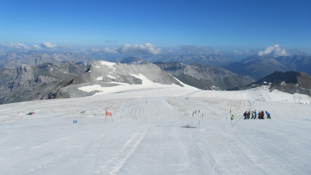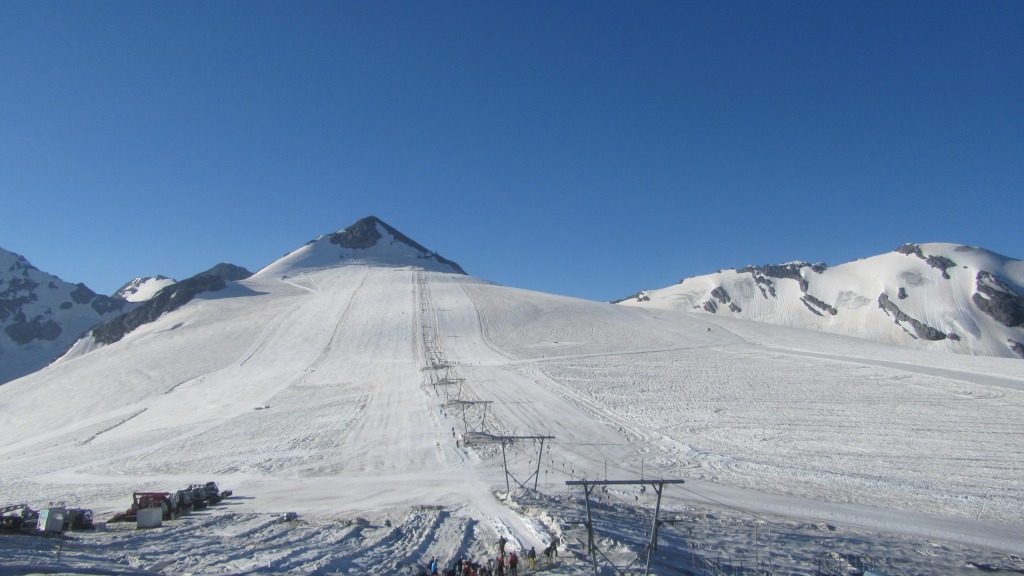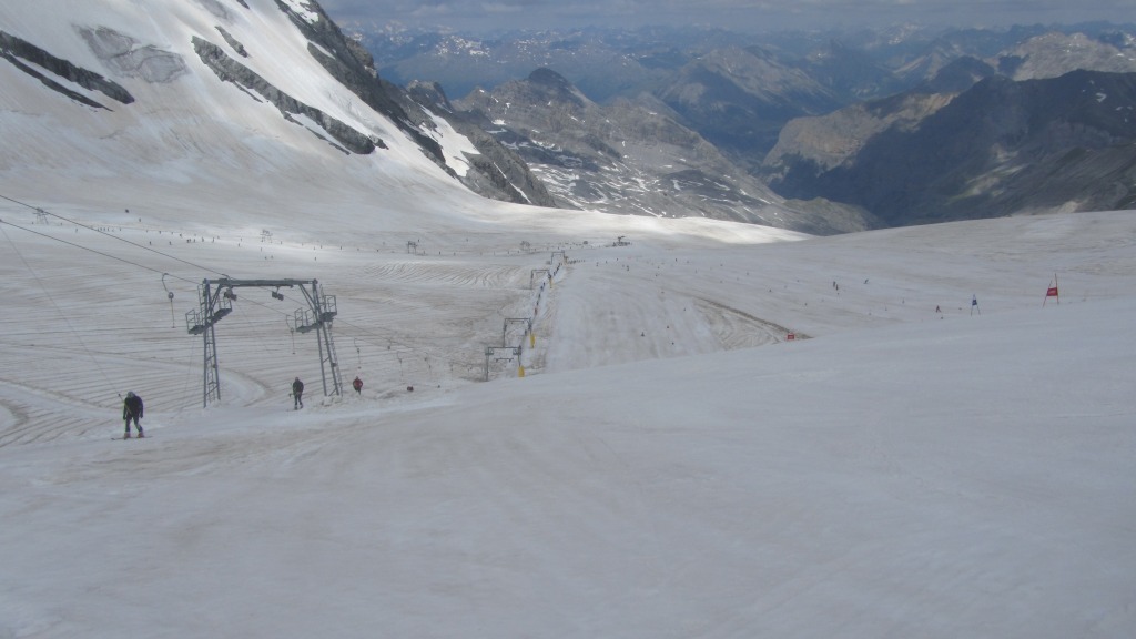 Sveglia alle 3.50, partenza 4.15 e alle 7 ero pronto in coda alla funivia del Passo. He, non che mi aspettassi la coda, ho dovuto aspettare la 3a funivia prima di poter salire ma almeno mi sono fatto una cultura su tutti i giochi installabili su smartphone grazie alla moltitudine di pseudoadolescenti supermazzinga. Il ghiacciaio si presenta subito in forma, bello bianco e quasi completamente coperto di neve. Fino alle 10 neve dura e veloce, poi ha smollato ed alle 11 era primaverile. Pensavo alla solita impietosa scena dei torrenti dentro le piste con neve marcissima ed insciabile invece era semplicemente primaverile, tanto che quando gli sci oramai non scorrevano più sul piattume generale dello Stelvio sulle Payer c'è stato di che divertirsi.