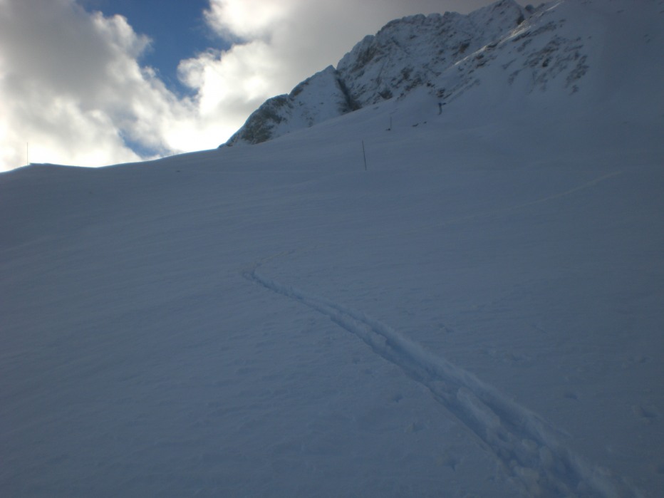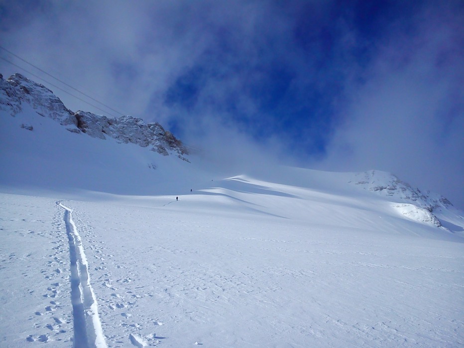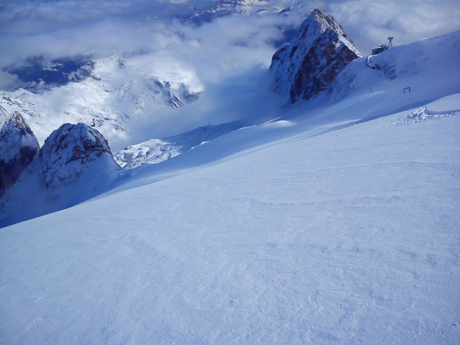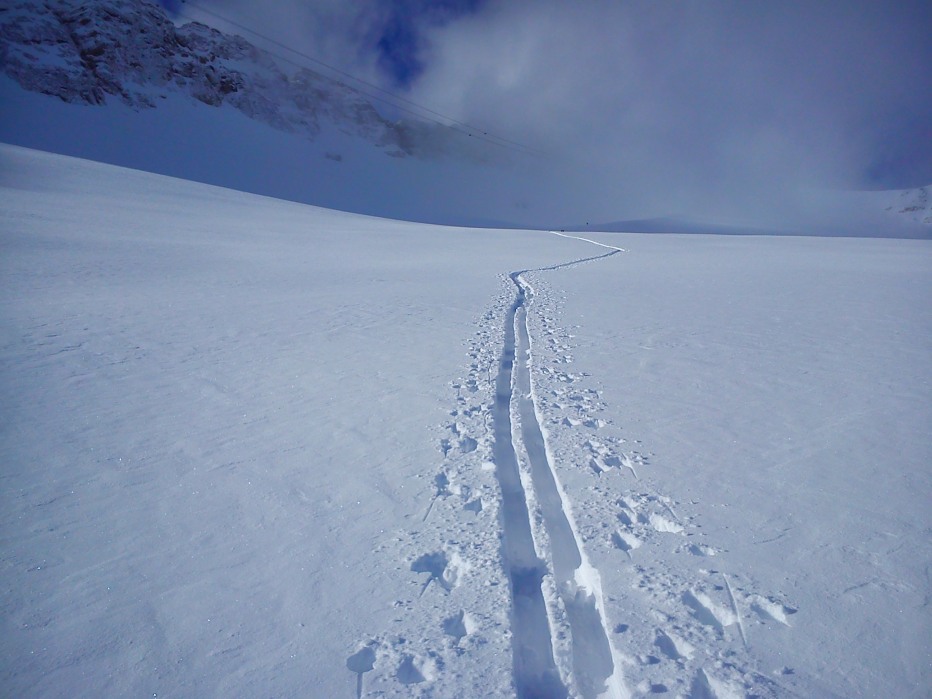 Il modello è il solito: sveglia alle 4.30, partenza alle 5.30, cd dei Muse a manetta, alle 7.30 al Fedaia; fatico ad arrivare al passo con le gomme estive, le curve sono ghiacciate, la mia è la seconda auto. Vedo due skialper già pronti a partire e tiro un sospiro di sollievo, non devo batter traccia!