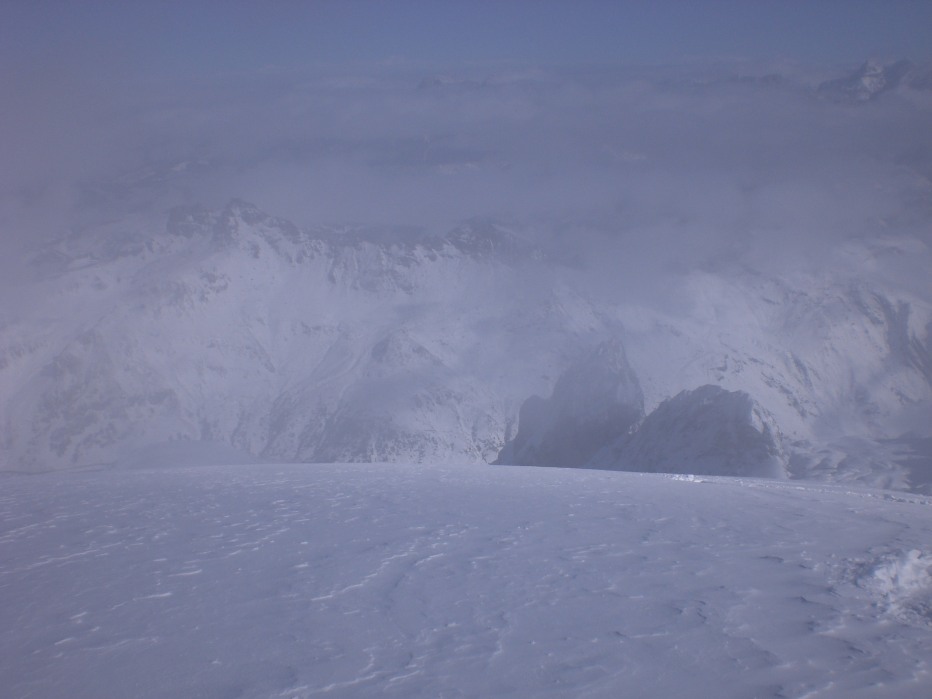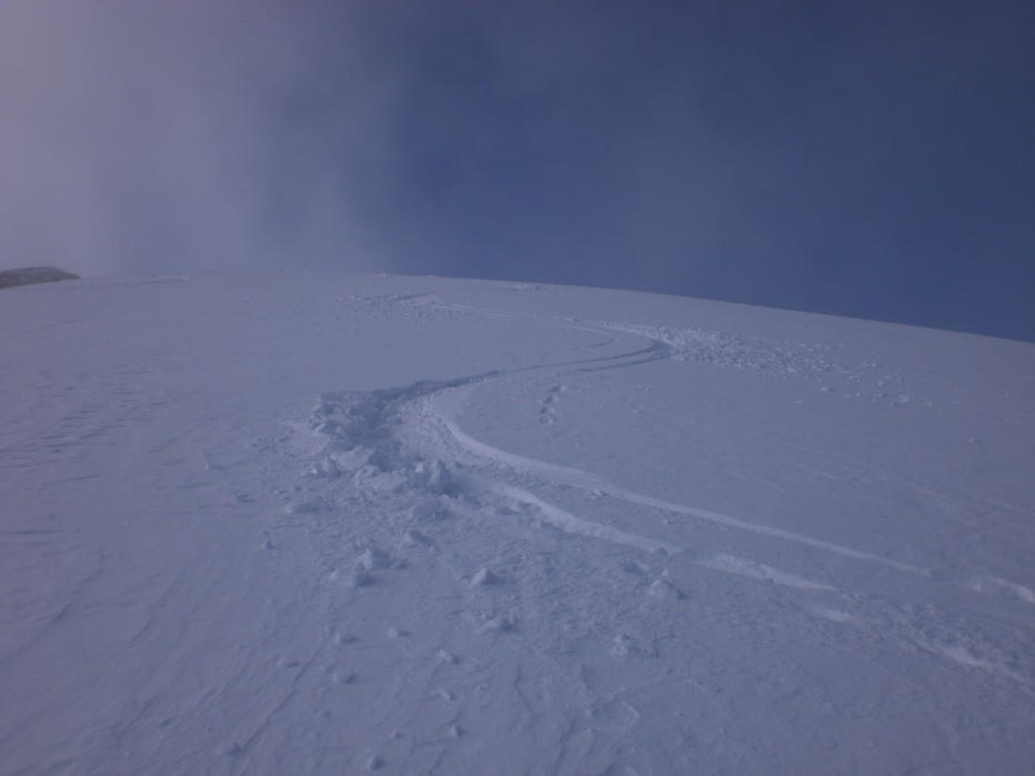Alle undici sono in cima, tira vento, tolgo le pelli, mangio una barretta, mi riprometto di riposarmi per godermi di più la discesa ma...la scimmia è troppo grande, la paura che mi rubino il giochino si impadronisce di me, via via, devo scendere, cominciano ad arrivare!