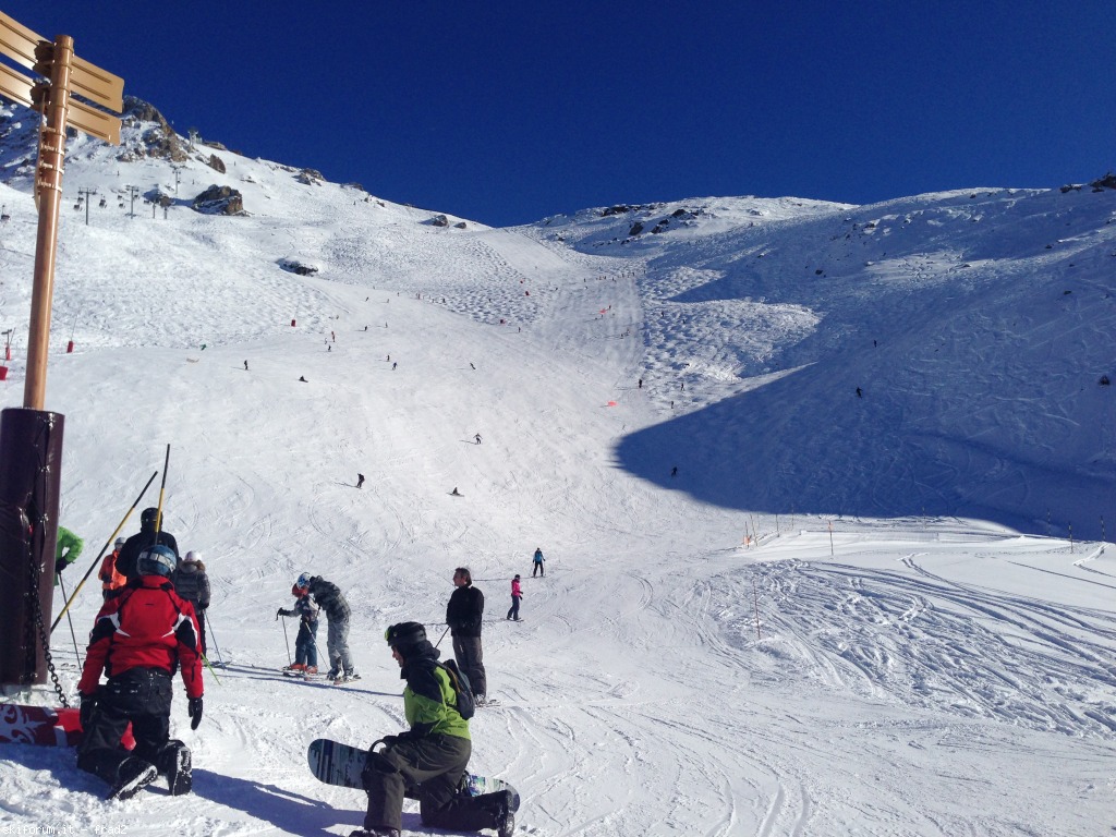 Il secondo giorno, cioè il 31 scio ancora in solitaria e la giornata si presenta spettacolare sin da subito, salgo sull'altro versante, ossia quello che mi porterà a Les Menuires e in Val Thorens. Qui la vista è incredibile, una volta un cima ovunque mi giri ci sono impianti di risalità, gente che si disperde bene tra le varie piste e quindi pochissima coda agli impianti (a differenza di Courchevel). Neve cosa ve lo dico a fare....