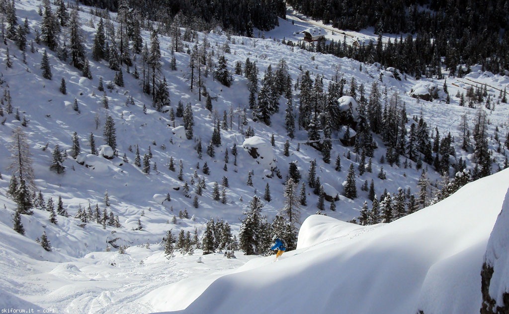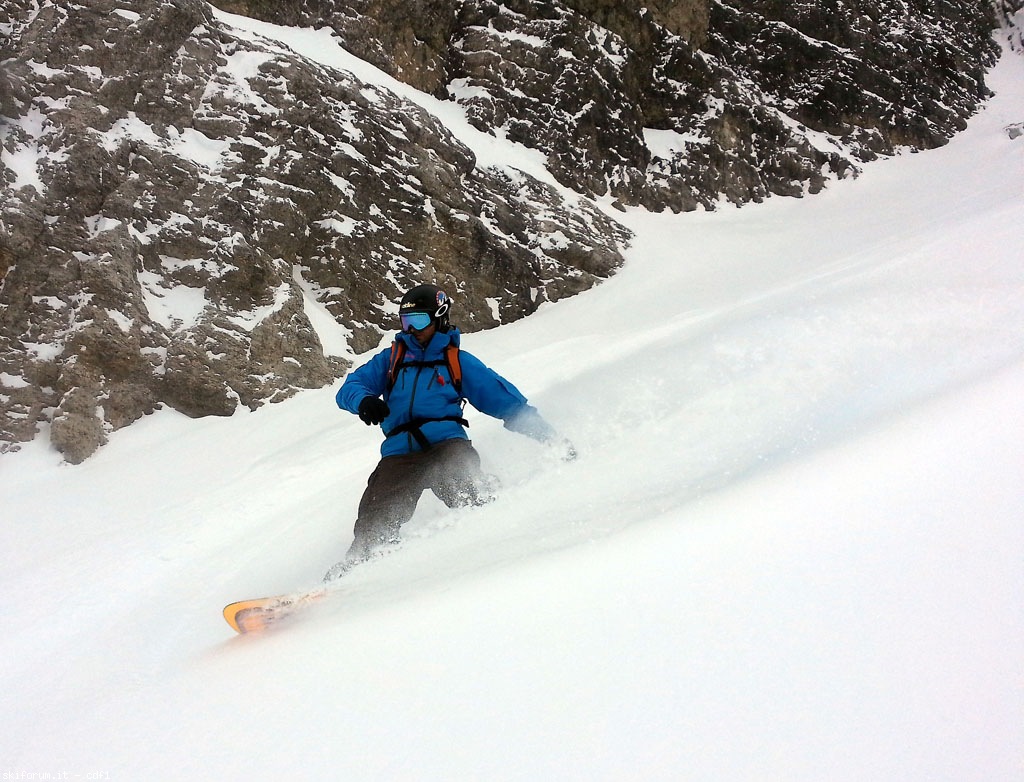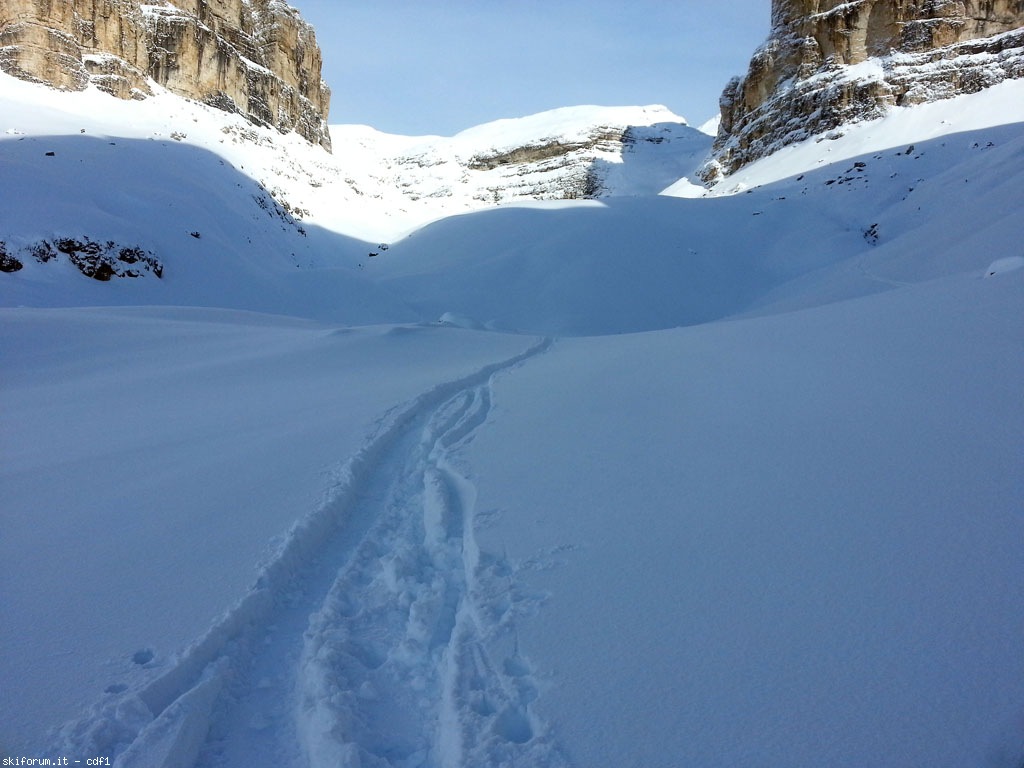 Martedi' 21: Partiamo alla volta della Marmolada, tra impianti e file da Canazei ci impieghiamo piu' di 2 ore. Ci spariamo un polveroso Intra i Sass, poi il mio compare era stanco e torniamo al Padon, scendendo il canale Ornella appena sciato. Tornando in cima a Porta Vescovo abbiamo visto due skiers che andavano ad aprire un canale che già conoscevo. Quindi siamo scesi sotto il canale della funivia, traversato la pista e via nel canalino ripido all' inizio e stretto ma che poi si allarga su un bel pendio.