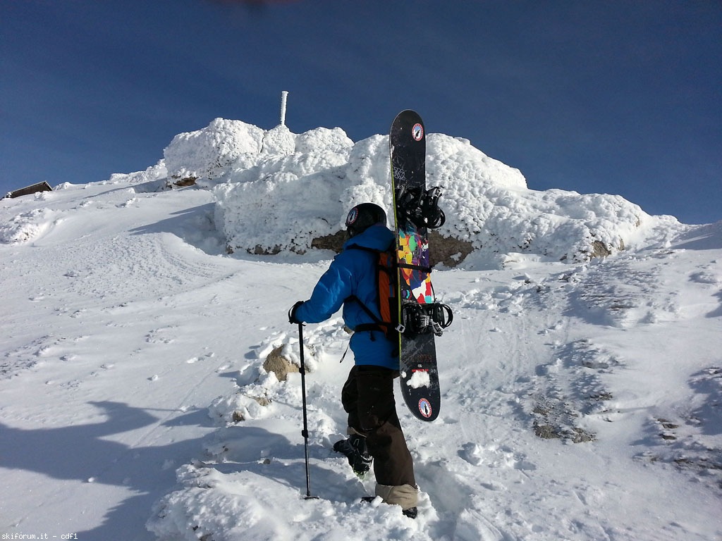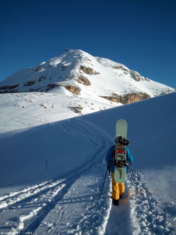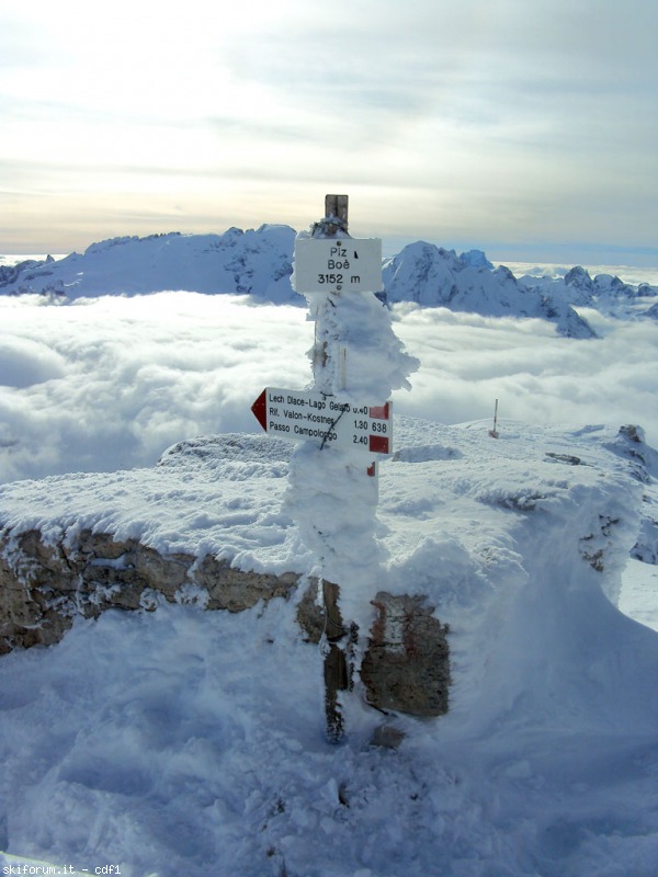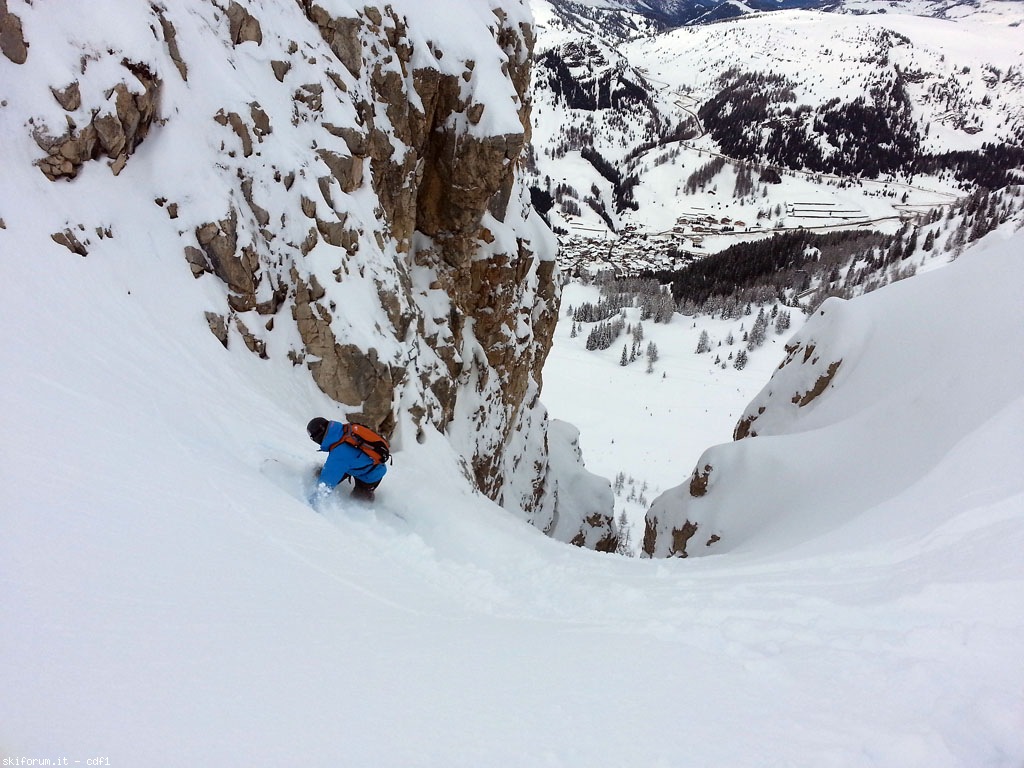Giovedi 23: Per recuperare tempo prezioso saliamo con l'auto fino al passo Pordoi riuscendo a prendere la prima funivia. Il tempo in alto è splendido, sotto in valle un mare di nubi. Dopo le classiche foto panoramiche dalla terrazza ci dirigiamo in cima al Piz Boè. Ci sono solo due/tre tracce che sono scese per la valle delle fontane. Noi scendiamo invece per il primo canale che da sul Vallon, poi risalita al colletto e discesa per il canale del ghiacciao. Logicamente tutto "first track". Quindi Val Mezdì ancora non tracciatissima e lungo ritorno via piste a Canazei.