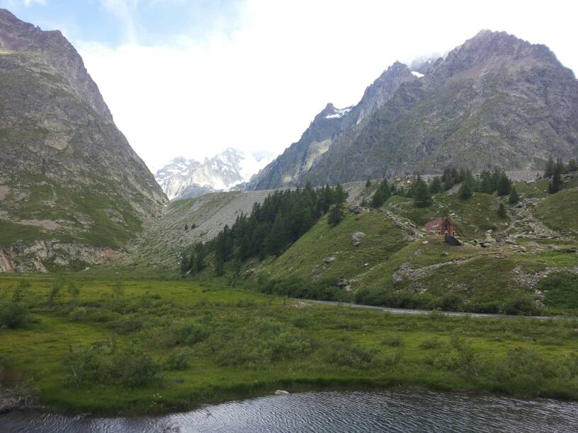 Il primo tratto ha la vista bloccata dalla morena del Miage, il più grande ghiacciaio della val d'Aosta. Una volta passata la morena, si entra nella zona del bel lago di Combal, che si attraversa tutto: