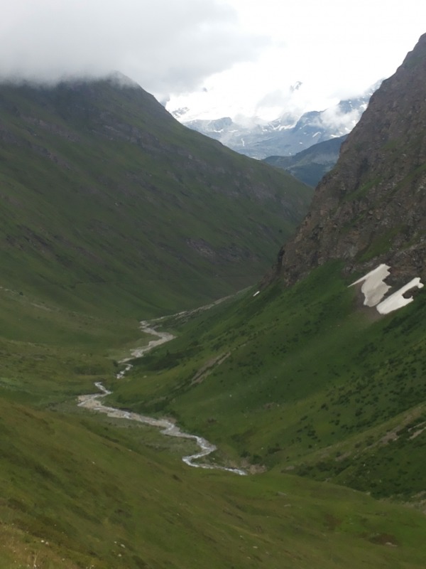 Una volta al passo io e solo io devio verso sud per un sentiero in cui non incontrerò anima viva, che si dirige verso il col de Chavannes, primo colle dell'Alta Via n.2 della val d'Aosta. Il sentiero a metà si riunisce col vero sentiero dell'alta via, più diretto, ma anche qui non incontro nessuno. Solo una volta in cima mi ritrovo 5 biker tedeschi ambosessi che vengono da La Thuile. Il sentiero che scende e che farò anche io è infatti perfetto per le biciclette ed è fattibile anche in auto (non ci sono divieti). È una lunghissima carrabile di circa 15 km che percorre il bel vallone di Chavannes. Nella mia discesa incontrerò 3-4 auto e un camion (!), tutti operatori diretti ai vari alpeggi della valle. Poi supererò un anziano che passeggiava con la nipotina quasi in fondo, e nessun altro. Neanche i biker incontrati in cima mi superano, perchè evidentemente sono scesi a Courmayeur, pazzi! (il lato val veny per il primo tratto non mi sembra fattibile con le bici, boh).
