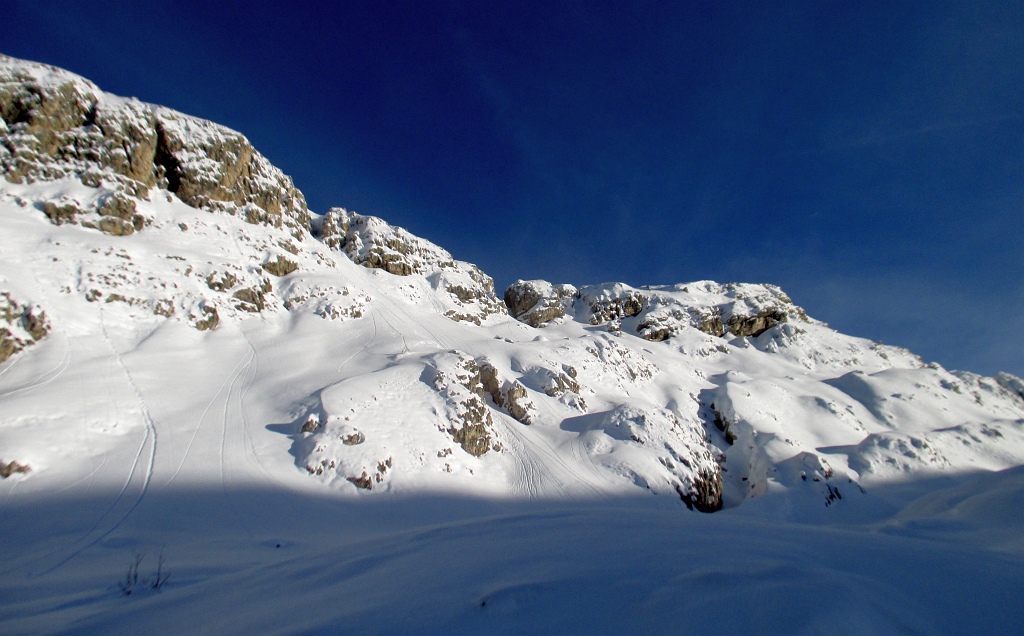 Già al passo ci sono dai 30 cm in su di neve. La giornata è bellissima e le velature in cielo non fanno paura.