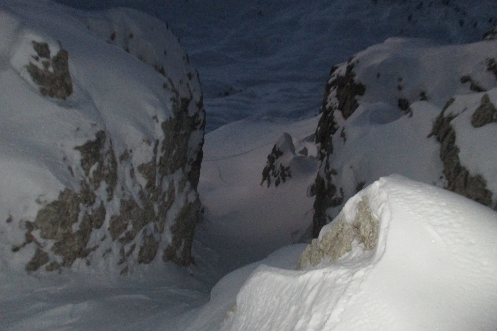 E poi si scende, quasi al buio. Al canalino dobbiamo fare un po' di attenzione ma la neve è super!