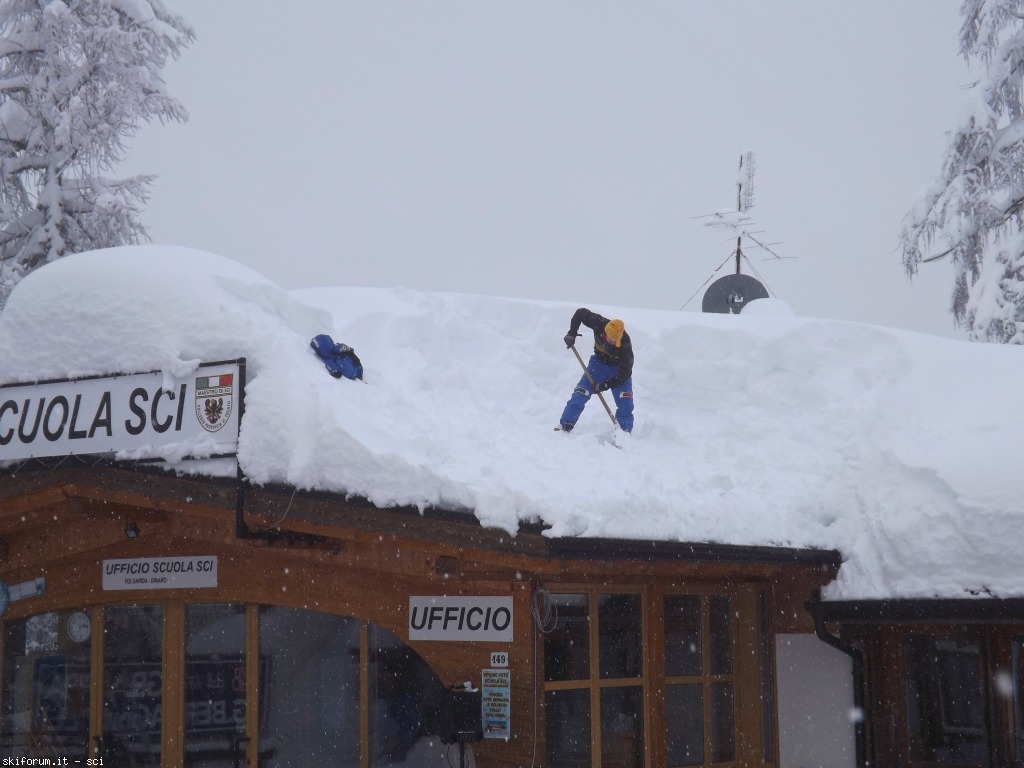 Si spala sopra il tetto della scuola sci per togliere un po' di peso.