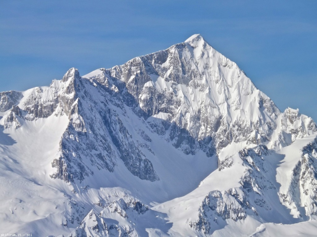 Zoomata sul Monte Vigo e la zona di Folgarida-Marilleva dal Grostè. Si vedono il Rifugio Orso Bruno e gli arrivi delle tre seggiovie (6p automatica Orso Bruno/3p Vigo/3p Malghette). Notare anche le piste: in primo piano la sempre affollatissima rossa delle Malghette. Pista che serve da collegamento tra i 2 comprensori di Folgarida/Marilleva e Campiglio, e che già alle 9 di mattina si presenta distrutta. Da questa foto sono ben visibili i numerosi cumuli di neve sul muro principale. Vicino il rifugio Orso Bruno si intravede la pista relativa, l'Orso Bruno. Mentre a destra si vedono in alto l'inizio della rossa Delle Rocce e più in basso, poco prima dell'attacco del muro della Malghette, la prima parte della divertente pista Busa del Vigo.