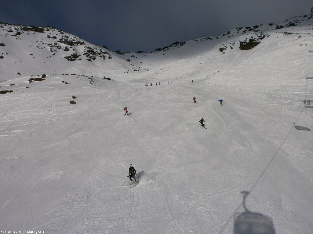 Si vede già la pista che piega a dx direzione rifugio con una pendenza costante e non esagerata su cui carvare in piena velocità, se solo l'affollamento lo consentisse