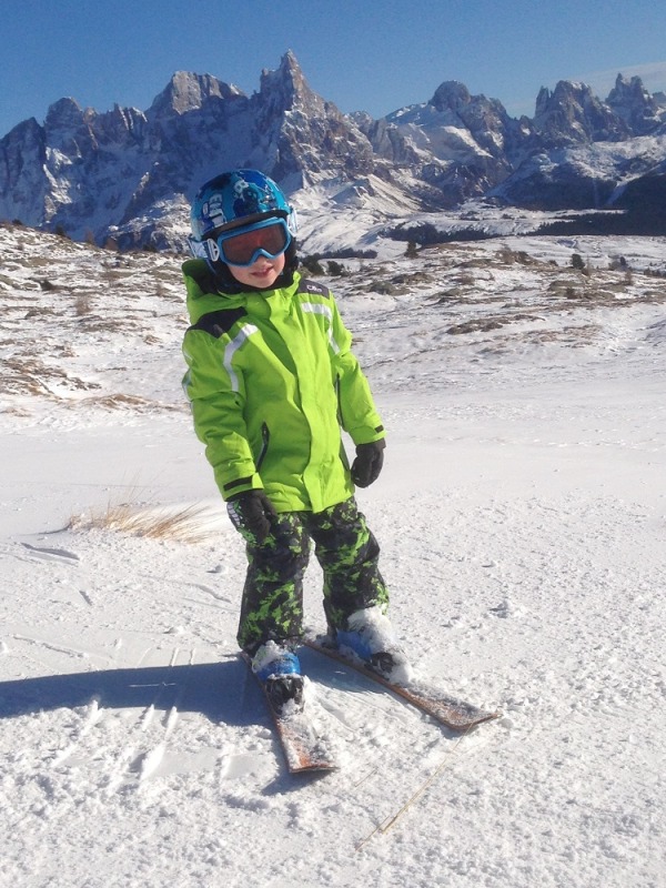 Mio figlio in Pista, sullo sfondo il passo Rolle con le pale di San Martino
