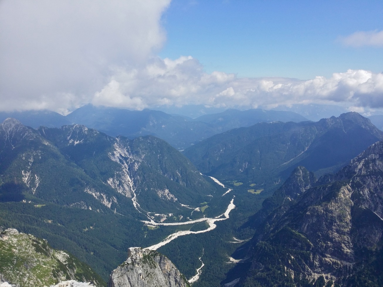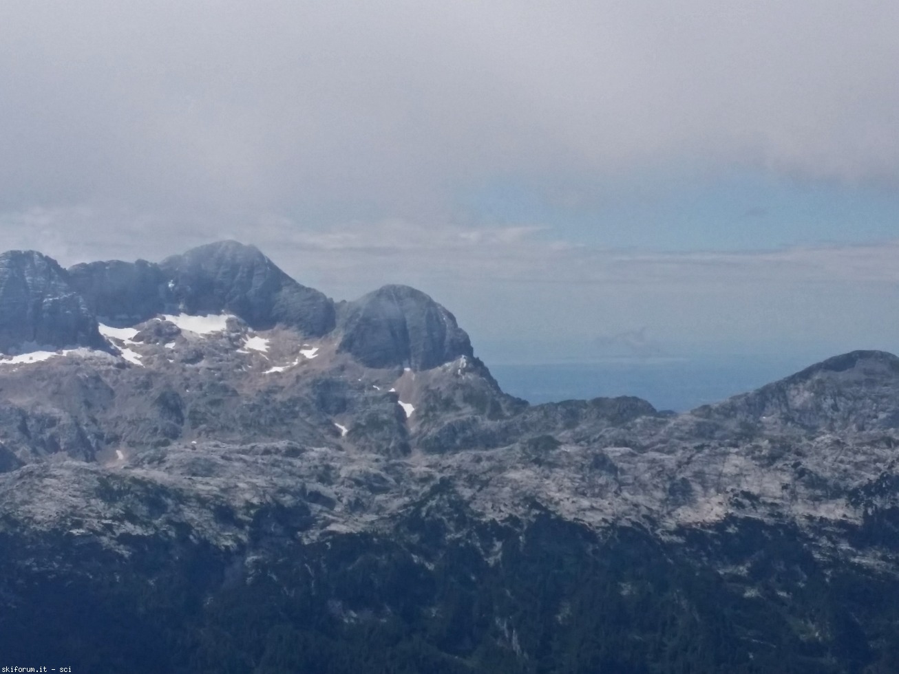 Dalla vetta, guardando oltre il Canin, si scorge perfettamente la penisola di Lignano Sabbiadoro con il Mare Adriatico e, in primo piano, la laguna di Marano.