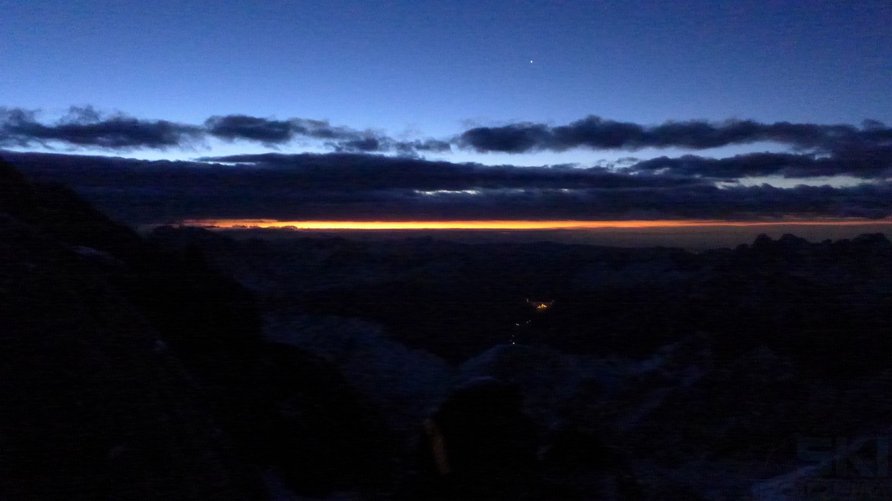 Scendiamo dalla funivia che è ancora buio pesto e mancano ancora diversi minuti per l'alba ma la curiosità è troppo forte. Anzichè rimanere in "anticamera" al calduccio tutti vogliono andare in avantscoperta del terrazzone.