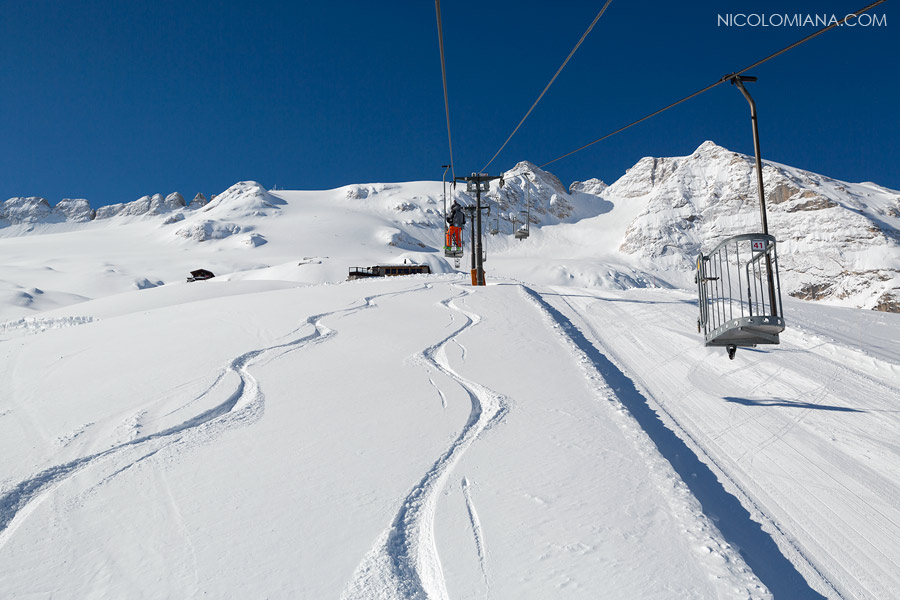 A Pian dei Fiacconi molti scialpinisti procedono verso Punta Rocca.