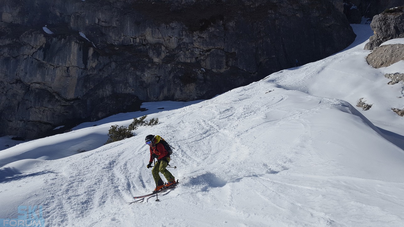 Il canale prosegue sbucando su dei soleggiati boschi di mughi con neve morbida al sole e ghiacciata all'ombra.