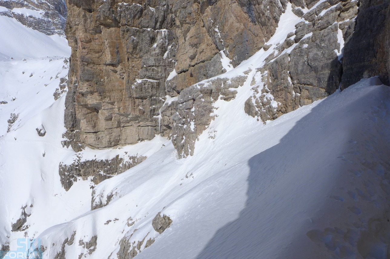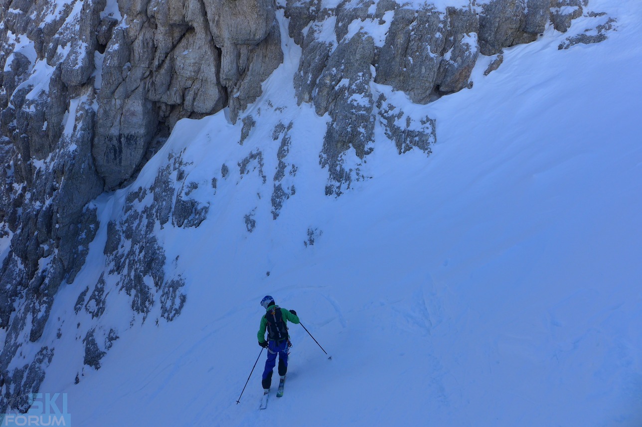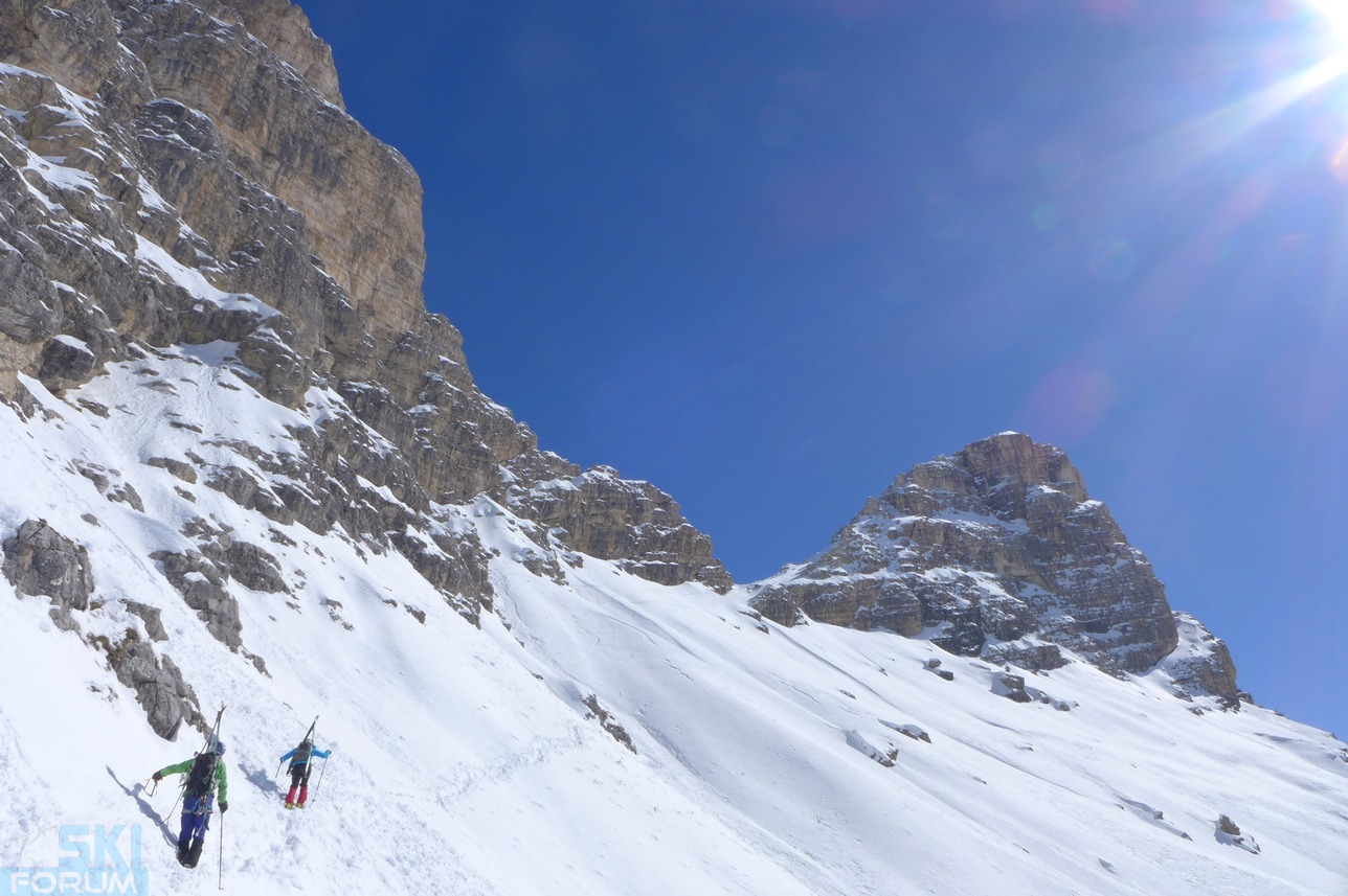 La salita non è difficile ma è tutta in traverso, tutta su un piano inclinato in cui non è vietato cadere e per il quale è necessario che la neve sia perfettamente stabile. La discesa benchè non sia tra più ripide delle dolomiti non va presa alla leggera. Con neve molto dura una caduta può significare un lungo scivolone..