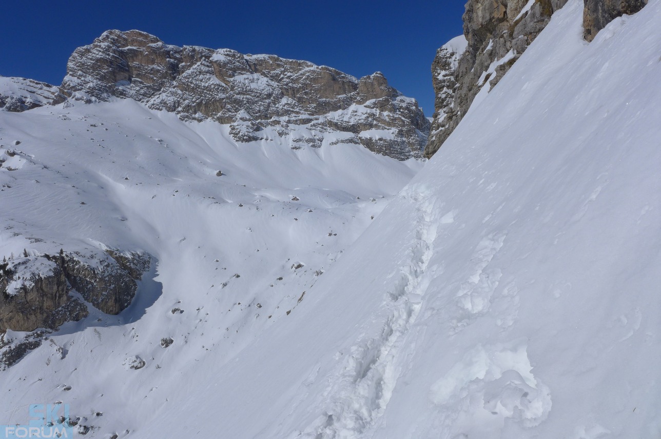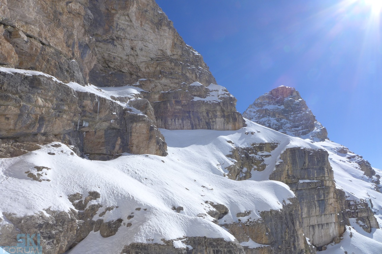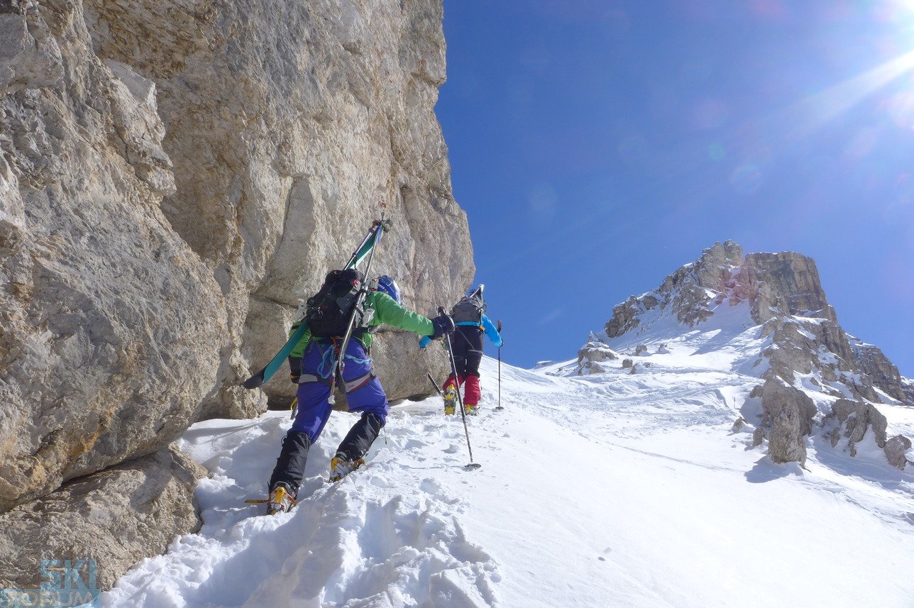 La salita non è difficile ma è tutta in traverso, tutta su un piano inclinato in cui non è vietato cadere e per il quale è necessario che la neve sia perfettamente stabile. La discesa benchè non sia tra più ripide delle dolomiti non va presa alla leggera. Con neve molto dura una caduta può significare un lungo scivolone..