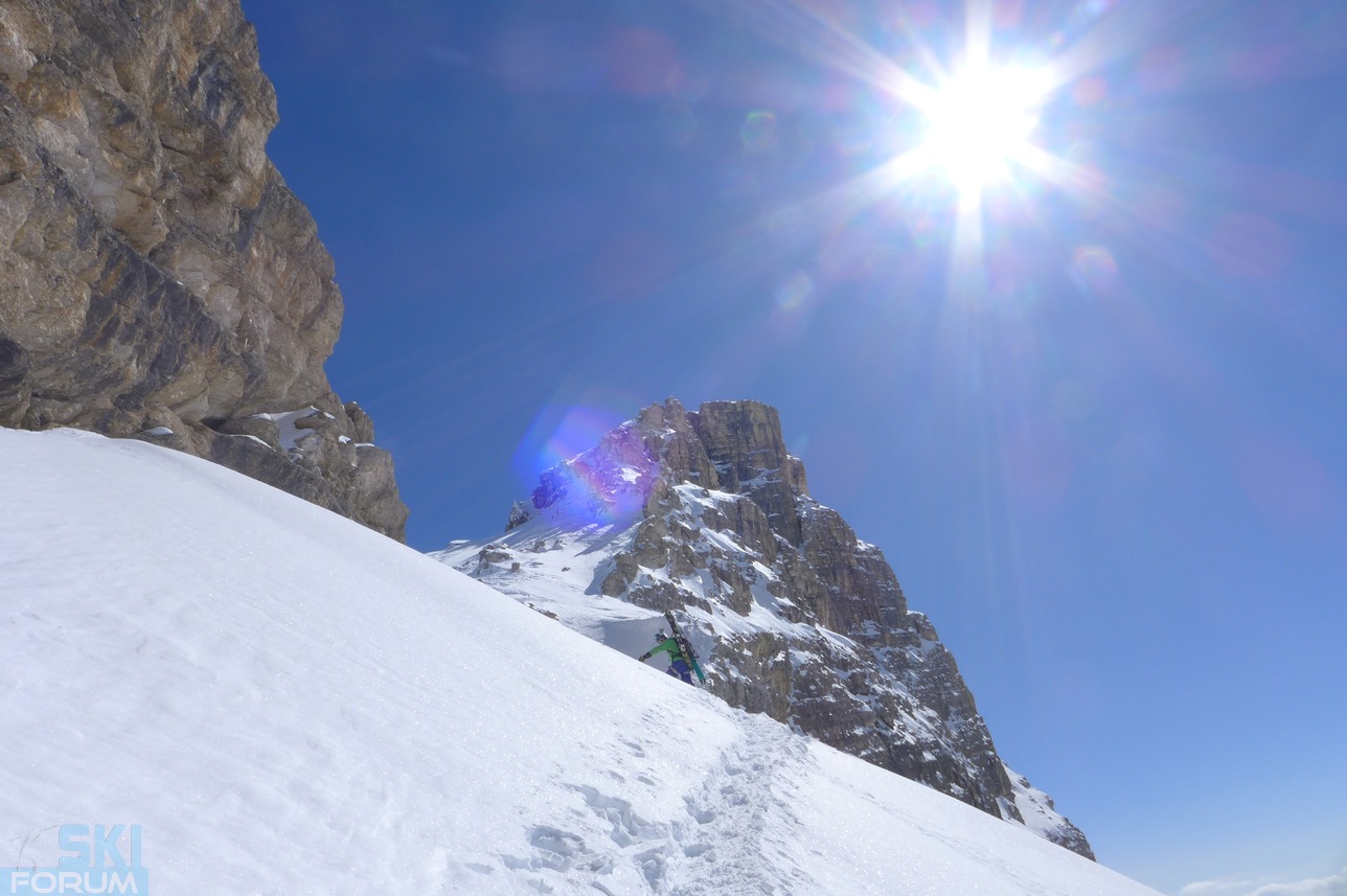 Usciti dallo spigolo la via continua in costa lungo pendii molto inclinati pieni di piccole scariche di neve (quel giorno super stabile per fortuna).