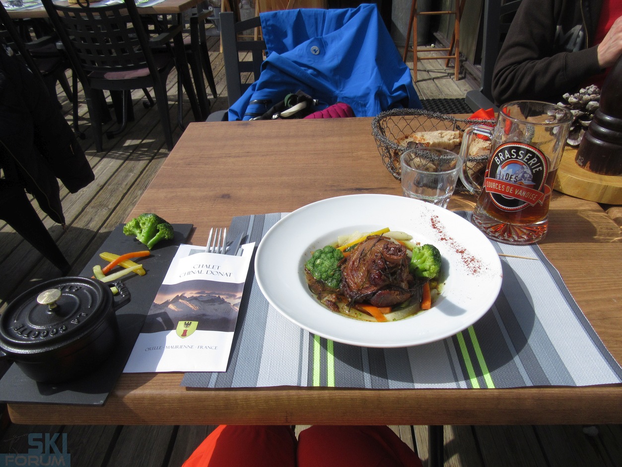 Ci fermiamo a pranzo al rifugio posto all'arrivo della cabinovia che sale da Orelle lo Chalet Chinal Donat. Io mi sparo un piatto tipico che più tipico non si può gli altri provano l'agnello e le trote.